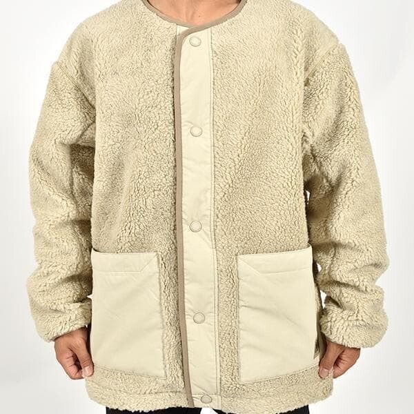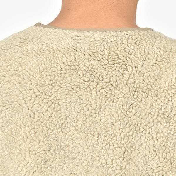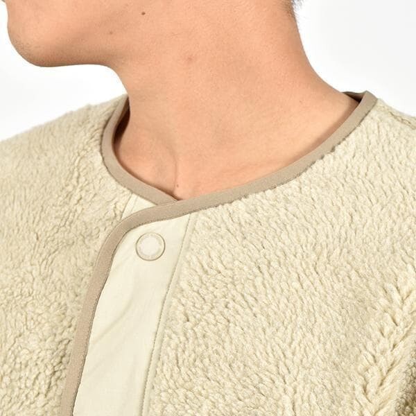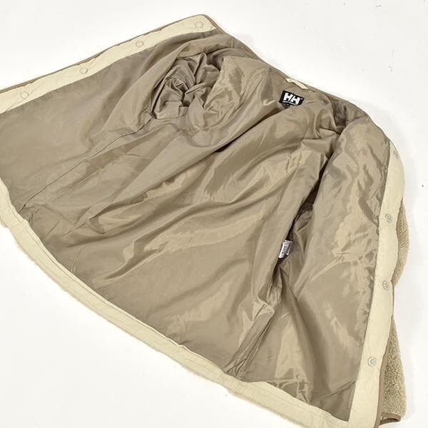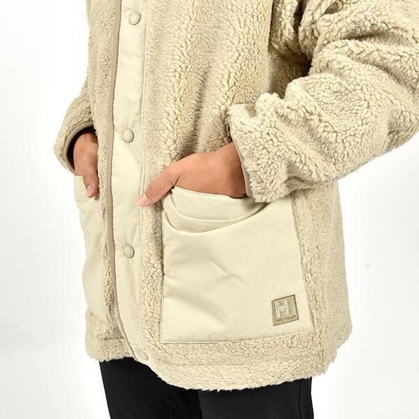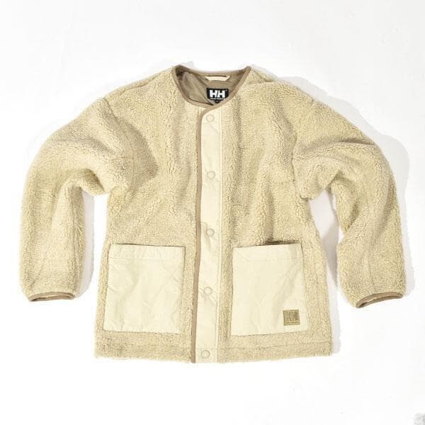 HELLY HANSEN(ヘリーハンセン)Flameproof Wool FIBERPILE THERMO Work JACKET(フルームプルーフウール ファイバーパイル サーモ ワーク ジャケット) 素材:FIBERPILE THERMO Flameproof Wool (モダクリル46% ポリエステル31% 毛23%) 裏地:ポリエステルタフタ(ポリエステル100%) カラーOM-オートミール フリースの元祖ともいえるHELLY HANSENの定番素材、ファイバーパイル サーモに、ウールと難燃性素材をプラスしたシリーズのジャケット。2022年秋冬シーズンモデルでは、さらに難燃性が向上し、寒い季節のキャンプなどアウトドアシーンでのアウターとして活躍します。独特のボア感のあるクラシカルな印象はそのままに、やわらかさが増して着心地のよい風合いに。火の粉に触れても燃え広がりにくい難燃性があるため、キャンプの焚き火シーンで重宝。ポケットなどにあしらった別布にも、難燃性生地を使用しています。ヨーロッパのワークジャケットをイメージしたデザインで、中に着込めるゆったりとしたシルエット。身生地と同色のヘリテージロゴなど、タウンユースもしやすいデザインに仕上げました。同素材のオーバーオール(商品型番:HOE22260)とのセットアップをはじめ、さまざまな着こなしが楽しめます。 定価37,400円