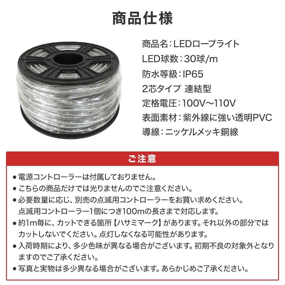 | 高輝度LEDロープライトは従来のロープライトと驚くほどに輝きが違い、 鮮やかな発光色、とても綺麗な輝きです。 店舗の飾り付けやイベント、パーティー、ハロウィンやクリスマスに。 生活防水仕様なので屋外での使用ももちろん可能!! 1m単位でカット可能!! フェンスや屋根にそって飾ったり、動物、ツリー、星、文字の形を作ったり自由自在に使えます。!! 別売りの電源コントローラーで8種類の発光パターンが楽しめます。 【仕様】 カラー:ミックス 商品名:LEDチューブライト(10mm/2芯) 長さ:50m 消費電力:約1.58W/m 定格電圧:100V~110V 防水レベル:IP65 LED数:約30灯/m 表面素材:紫外線に強い透明PVC使用 導線:ニッケルメッキ銅線使用 ※電源コントローラーは付属しておりません。 ※こちらの商品だけでは光りませんのでご注意下さい。 ※必要数量に応じ、別売の電源コントローラーをお求め下さい。 ※約1m毎に、カットできる箇所【ハサミマーク】があります。 (LED チューブライト ハロウィーン イルミネーション X'mas 電飾 飾り クリスマスツリー ツリー イルミネーションライト 店舗 デコレーション ) |