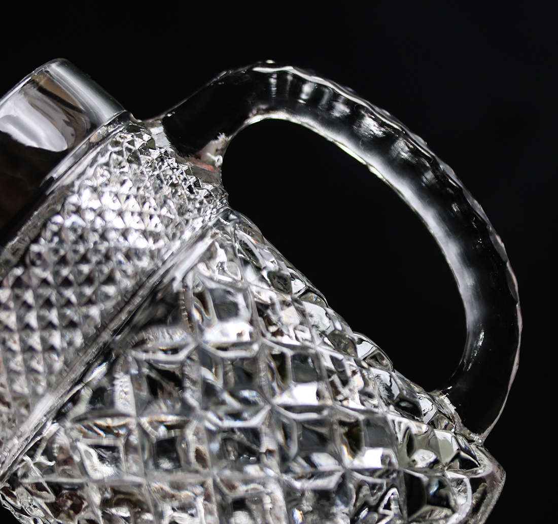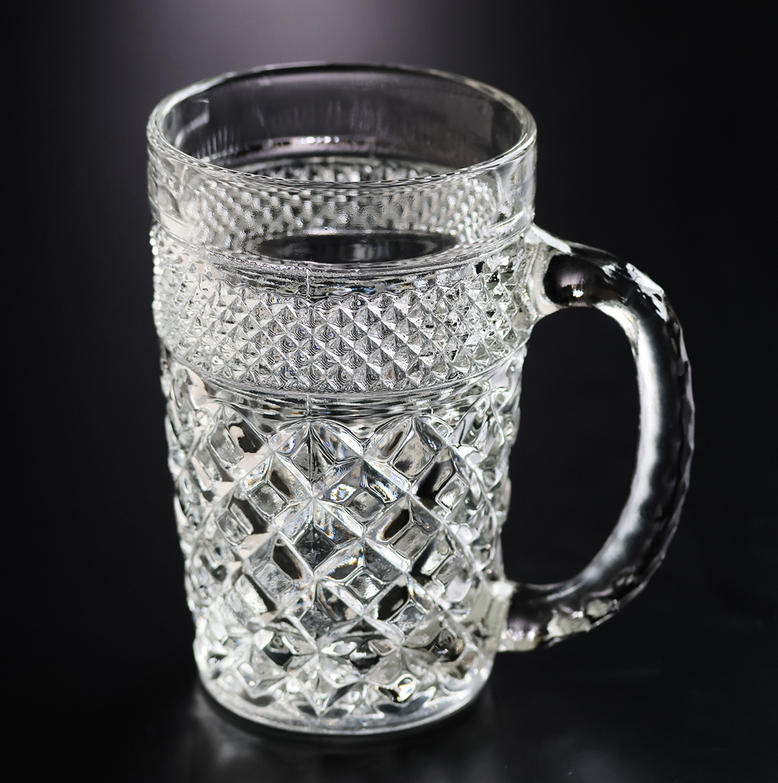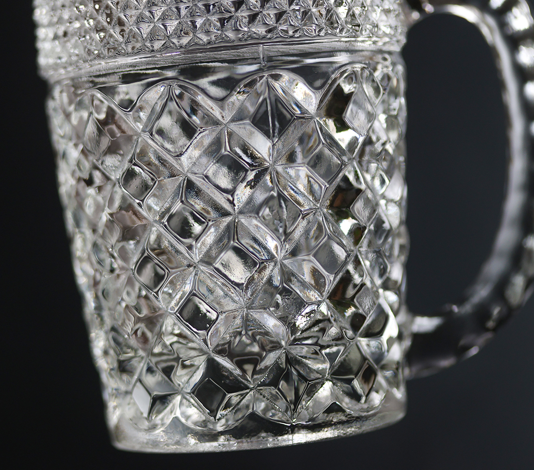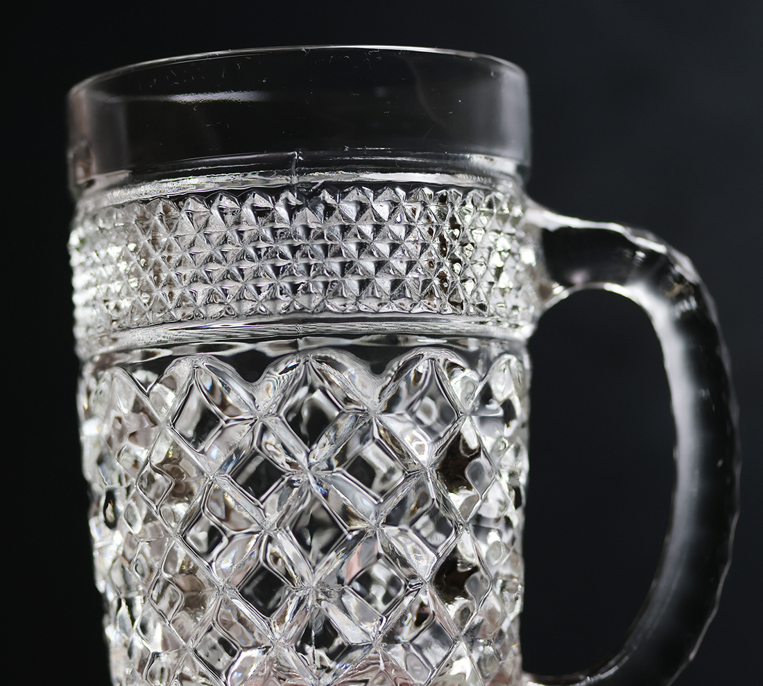 【商品の状態】 ★★★★★★ 製造年: 1960年~1970年代 製造国: アメリカ 直径: 7.7cm 高さ: 13cm 容量 400ml とても状態の良いファイヤーキング”ウェックスフォードクリスタル”シリーズのマグカップ/ビールジョッキです。 ヒビ、カケなく、ツヤがあり、ミントコンディションです。リムのざらつきや使用感もなくとても艶やかです。 60サイズでの発送となります。送料は料金表をご確認くださいませ。M3-1 |