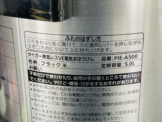 蒸気レスVE電気まほうびん 【中古】動作保証 TIGER タイガー魔法瓶 PIE-A500 5L ブラック とく子さん / 515242