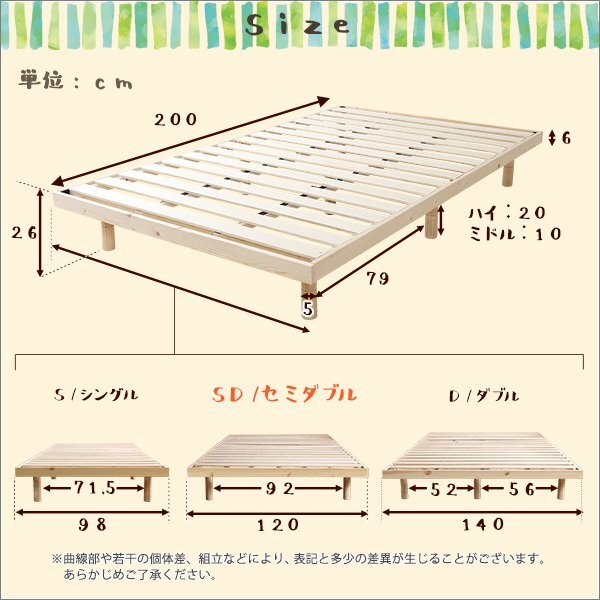 | <ベッド> 【カラー】 ブラウン、ナチュラル、ホワイトウォッシュ 【サイズ】 幅120x奥行200x高さ6/16/26cm 【重量】 20kg 【素材】 本体:天然木(パイン材) すのこ:合板(LVL) 表面材:ラッカー塗装(ホワイトウォッシュ、ブラウン) 無塗装(ナチュラル) 【梱包】 サイズ:122x26x20.5cm、重量:21kg 【組み立て品】 お客様による組み立てが必要です。 【ご注意】 サイズ、重量は概算です。 |