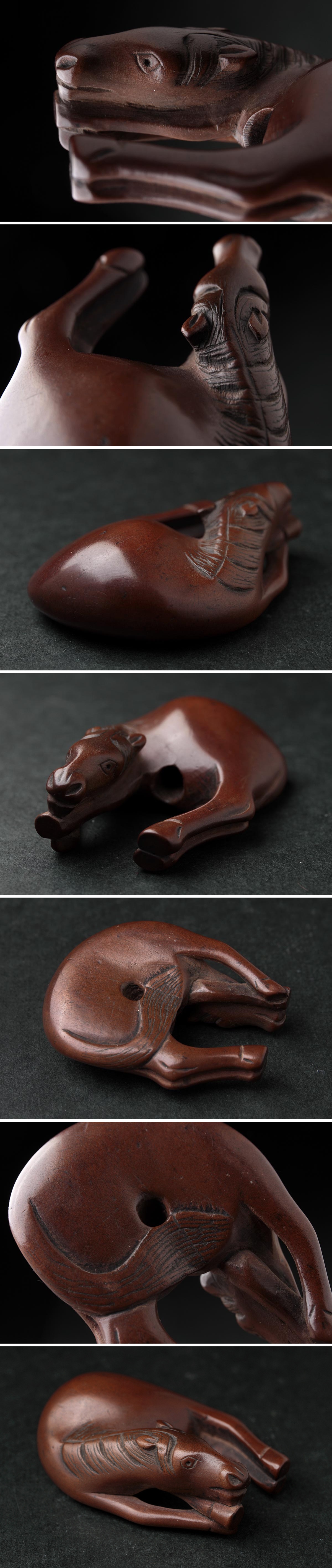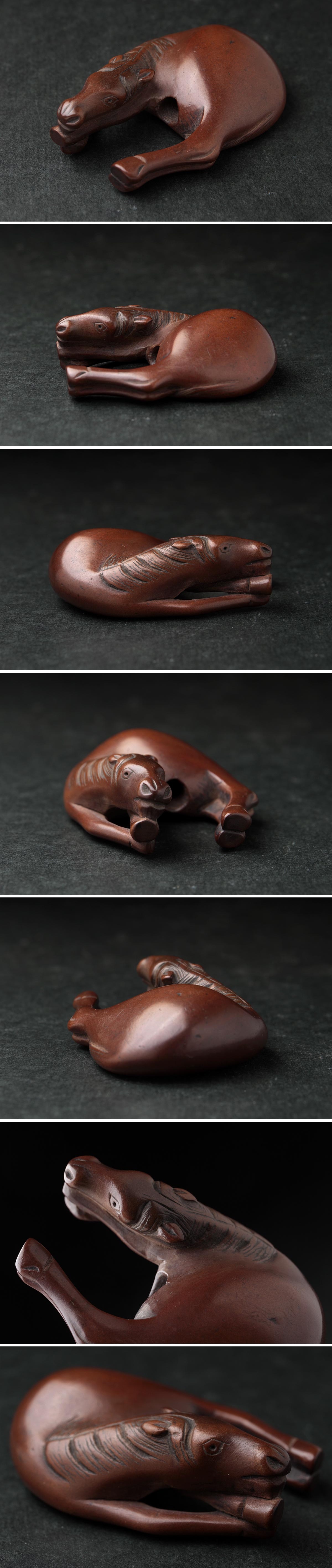 | ◆ 時代提げ物 柘植/黄楊木 木彫「馬」根付 幅5.2cm・木彫臥馬根付・形彫根付・古根付 提物 印籠 煙草入 装飾具 装身具 古美術 ◆