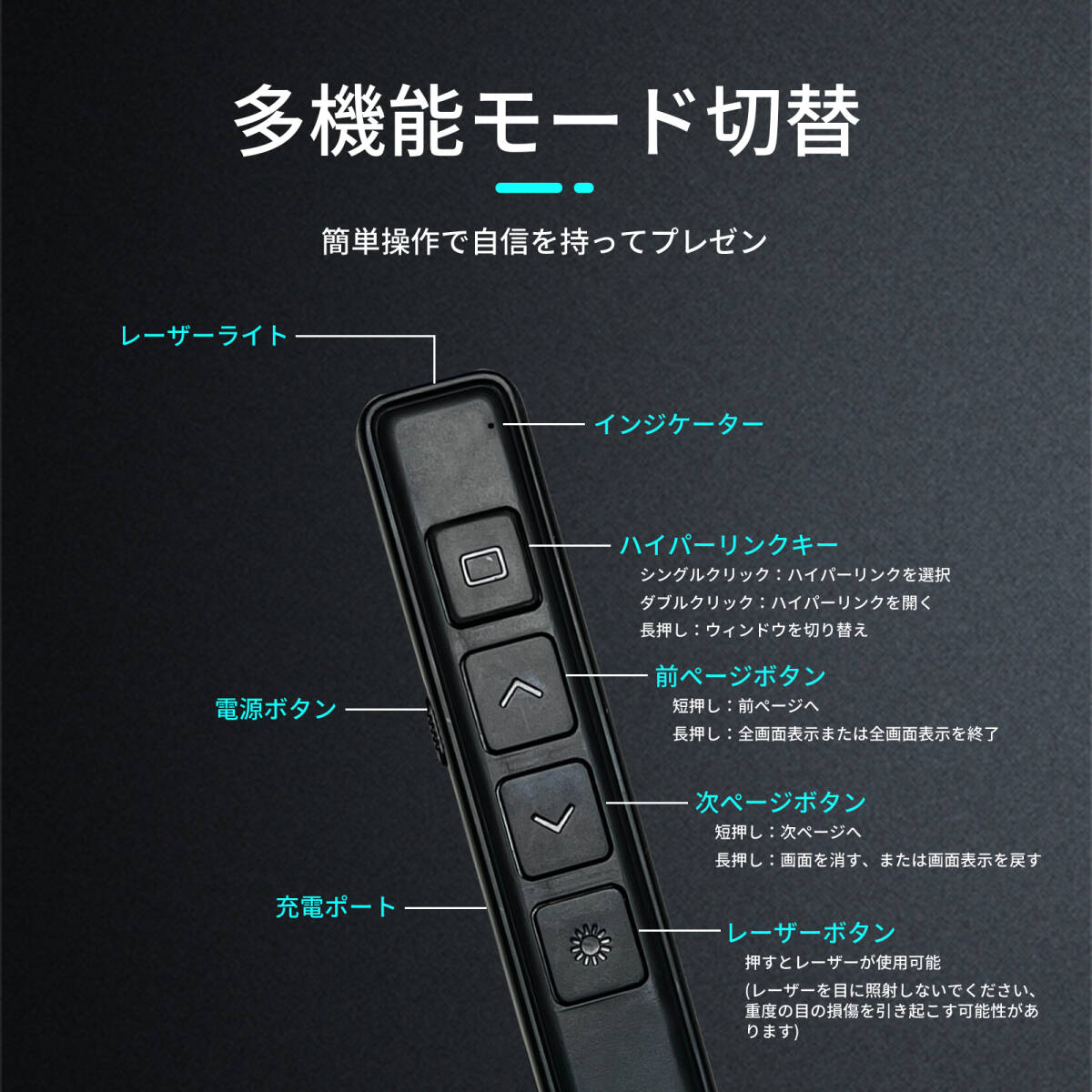 | 機能 | ハイパーリンク、全画面ブラックスクリーン、USB 充電、100 メートル遠隔制御、マルチシステム互換性、バッテリー残量低下リマインダー |