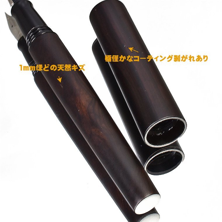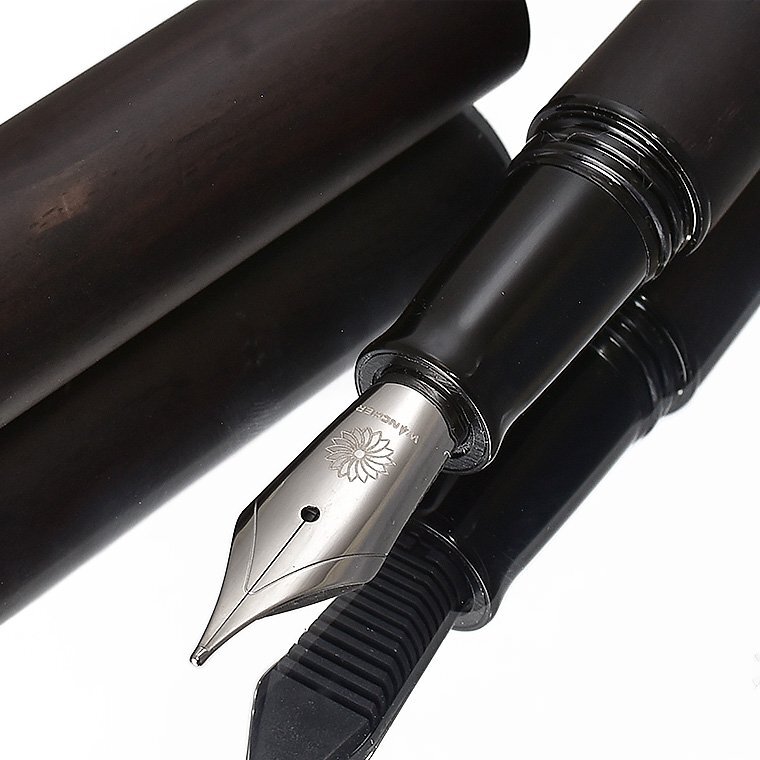 | 【Wancher/ワンチャー】 世界樹万年筆 黒檀(エボニー)新品 <アウトレットでの出品> ボディ軸に4cm程の木目のヒビ他があります。 (詳細はサムネイル9.10枚目写真参照) 大変お買得な商品となります。 ペン先:EF(極細)での出品 ![]() 世界樹(せかいじゅ)とは、インド・ヨーロッパ、シベリア、ネイティブアメリカンなど あちこちの国々で語られるの神話の中に登場する木のことです。 世界中が、一本の大きな木で繋がっているというもので世界樹は天を支え、 天界と地上、さらに根や幹を通して地下世界もしくは冥界に通じているという神話です。 世界中に同様の神話が存在します。世界が一つにつながり平和でありたいという思いは、 遠い昔から世界共通なのだと感じます。 WANCHERは、世界中が垣根なくつながり、平和になることを願って世界樹という、 世界の木々を材料とした、万年筆を作りました。 ![]() この、「世界樹万年筆」を生み出したのは、台湾の山の中にこもって、 木の彫刻を作り続けている洪明華氏の協力があってこそでした。 工業機械を使わず、原木から木製万年筆を縦に削り出すことにより 美しい形状の万年筆を作り出してきた、彫刻家洪明華氏の協力の元 この万年筆は生まれました。 もちろん、木を材料とし、NC旋盤を用い、同じ形状の万年筆を 複数作り出したいので手伝ってほしいとの申し入れを、 彼は簡単に受け入れてはくれませんでした。 一本一本自然の木の形状を見ながら、木を削り、世界に一本しかない 木製万年筆を作ってきた彼には、工業旋盤で単一の製品を作ることには 大きな抵抗がありましたが、美しい木の万年筆を、アートではなく、 芸術性の加わった製品として、多くの人に触れて使ってもらうという 全く新しい取り組みとして、受け入れてもらいました。 彼が作り出した形状を基に工業NC旋盤を用い、横回転転する、 木棒からの削り出しによる木製万年筆製作を試みました。 旋盤を用いることで、同様の形状のモデルを複数作り出すことが可能となります。 もちろんそれには、木工旋盤加工には、熟練した職人の技術が必要となります。 彫刻家、木材加工職人など、様々な方の協力のもと生まれたのが、この「世界樹万年筆」です。 ![]() キャップとボディの直径ロ長さ、エンドの絞り、手になじむ大きさとデザインのバランス、 今まで目にしてきた万年筆とは、ちょっと異なります。 均整とアンバランスが、自然の中の木々の枝のように存在します。 一本の木の棒なのに何故か惹きつけられるのは、そのためです。 木の質感と美しい形状を、指先から伝わる感触で楽しんでほしい。 そのために、一本の木の塊から、時には大胆に時には繊細に、丁寧に形状を削り出す 作業が、何度も繰り返されました。そして完成した、誰もがふと手に取りたくなる造形。 表面は細かなヤスリで徹底的に研磨され、 硬い木独特のシルクのような滑らかな感触に仕上げられます。 薄く墨を流したような木目の模様。自然が生み出す美です。 今回出品させていただくのは黒檀(コクタン)です。 「エボニー(EBONY)」の名で親しまれており、 木質は適度に硬く加工は容易、強靭で衝撃性に優れ、材面は油分を含んだ感触があり 美しく仕上がります。家具や楽器の装飾材として使われています。 ![]() 万年筆は、書くための道具です。 決して見た目のために使用感をおろそかにすることは許されません。 キャップは気持ちよくボディエンドに刺さり、ちょっと短め?と思われる軸は、 筆記するのに最適な長さとバランスになります。 (短めといっても、国産メーカーの万年筆の軸と同等サイズです) ちょっと書くときは、キャップを外してサラサラッと書き、じっくり書くときは、 エンドにキャップをつけて、ゆったり書かれると良いかと思います。 ![]() ペン先は6号サイズと呼ばれる大型のニブです。 素材はステンレスになりますが、 近年のステンレスペン先の書き心地は良好で筆圧の強めな方にもお薦めです。 また、大型ニブと相まって抜群の書き味を誇ります。 是非、使うほどに愛着が増していく木の万年筆を手にしてください。 ![]() ************************************************************** ≪商品詳細≫ 【WANCHER/ワンチャー】世界樹万年筆 黒檀 出品個数 :1個 素材 :黒檀(エボニー) ペン先 : スチール ドイツ製JOWO社 サイズ : EF(極細) 機構 : カートリッジ/コンバーター両用式*ヨーロッパ規格* 長さ : 約142mm 径 : 約16mm(最大径)/10.5mm(最小径) 重さ : 約22g キャップ :ねじ込み式 付属品 : WANCHERケース・カートリッジ3本・コンバーター内蔵 (こちらは口径:2.4mmになります) 参考価格 :10,000円(税込11,000円) 新品未使用 *天然木を使用しておりますので、素材の木目の出方や色味には個体差がございます。 また木材独特の僅かな凹凸や傷の様に見える木目などがある場合がございます。 製品の特性としてご理解下さい。 こちらも予めご了承ください。 <アウトレットでの出品> ボディ軸に4cm程の木目のヒビ他があります。 (詳細