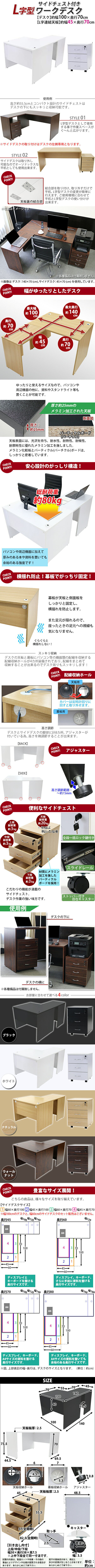 | 商品紹介 | ■作業スペースを広く確保出来る、L字型ワークデスクです。 ■サイドデスクの幅が約45cmのタイプです。 ■使いやすさ抜群の3段サイドチェスト付き。 ■引き出しは鍵を掛けると全段オールロック! ■会議室や事務所等、オフィス家具として様々なシーンでお使いいただけます。 ■天板には、メラミン加工を施しています。 ■幕板が天板と側面板をがっちりと固定!横揺れを防止します。 ■ネジ穴隠しのシール付き。(サイドデスクのみ付属) ■デスクの天板と幕板に配線収納ホールが2カ所ずつ備わっています。 ■アジャスターで高さの調節が可能です。(高さ調節範囲〜約15mm) ※こちらの商品は、組立て式です。組立てにはプラスドライバーが必要です。お客様でご用意ください。 ※組立図が付属します。 ※サイドデスクの取り付けはデスクの左側専用となります。 ■材質:パーティクル(パーチクル)ボード(メラミン加工)(本体、サイドデスク、サイドチェスト)、プラスチック(アジャスター、配線収納ホール、キャスター)、カークサイト(亜鉛合金)(取っ手、鍵)、スチール(スライドレール) ■重量:L字型デスク:約41kg (デスク:約28kg、サイドデスク:約13kg) サイドチェスト:約20kg ■L字型デスク総耐荷重:約80kg ■サイドチェスト耐荷重:約20kg(天板(引き出しに何も入っていない時))、約3kg(各引き出し) ■付属品:鍵2個(内スペアキー1個)、組立図 ●新品商品ではありますが、輸入商品の為、多少の擦り傷などがある場合がございますので、ご納得の上ご購入下さいませ。 ●ご購入後、お客様ご都合によるご返品、ご返金等は一切お受け致しておりません。 ●本商品を使用した際に発生したトラブル、事故につきまして、当社は一切の責任を負いません。ご使用に関しましては、全て自己責任にてお願い致します。 ※カラーはホワイトとなります。 |