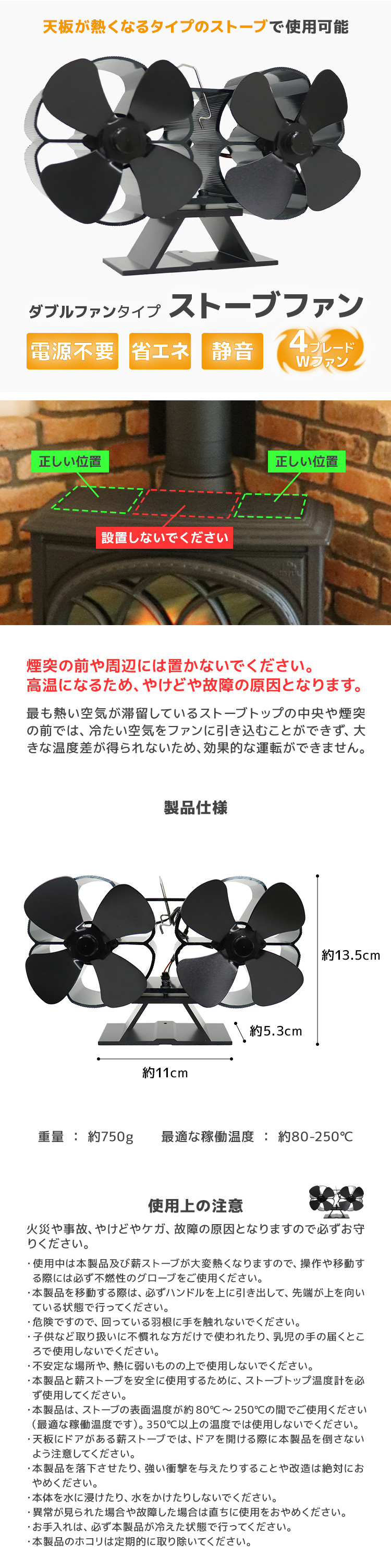 お部屋の暖気を循環!ストーブファンです!! 暖かい空気を部屋全体に届けます。 ストーブの上に置くだけ!熱で回るECOなファン!! 電源不要&電気代0円!省エネです♪ 静音設計でファンの音も気にならず、いつでも安心してご使用いただけます。 温度計機能付き。 ファン上部にモニターがあり、暖炉等の天板が適正温度か簡単に確認できます! 冬キャンプでの防寒対策としても抜群です☆ 【商品仕様】 サイズ:(約)高さ13.5cm×横幅11cm×奥行5.3cm ※横幅は土台部分のサイズです 重量:(約)750g 稼働温度:(約)80~250℃ 【注意事項】 ・商品は、モニターによって色合いが異なって見える場合があります ・仕様/デザインは改良のため予告なく変更することがあります |