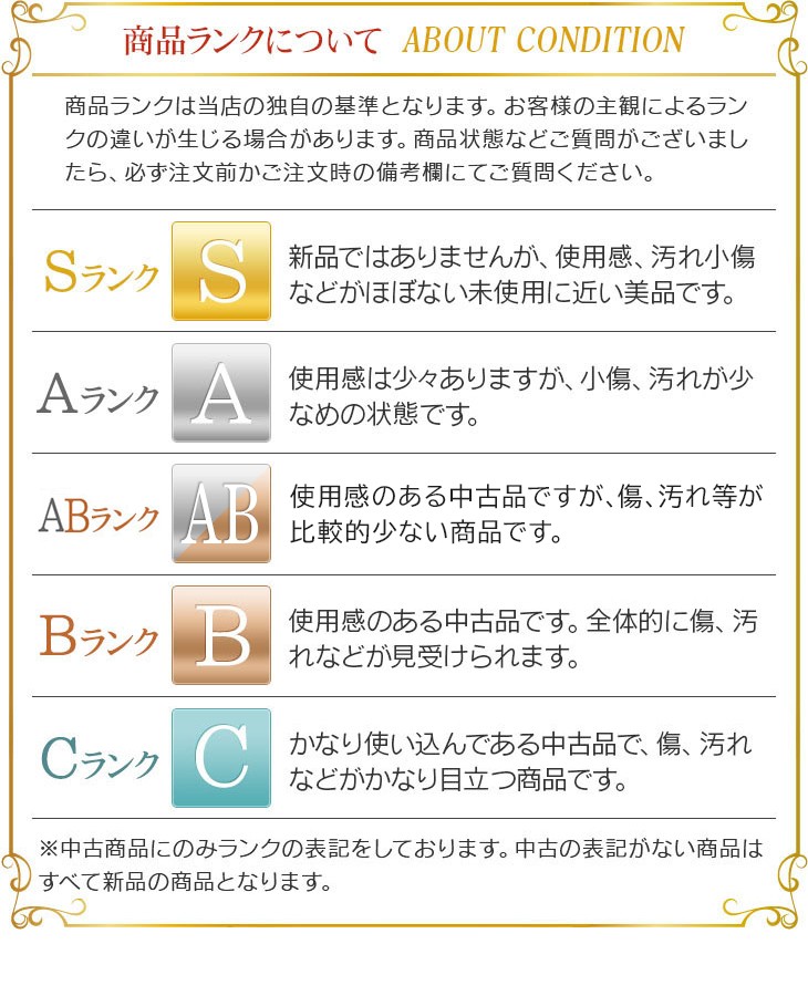 | ダメージ箇所 | 使用感があります。 角にすれがあります。 外側に汚れ、スレがあります。 内側に汚れがあります。 |