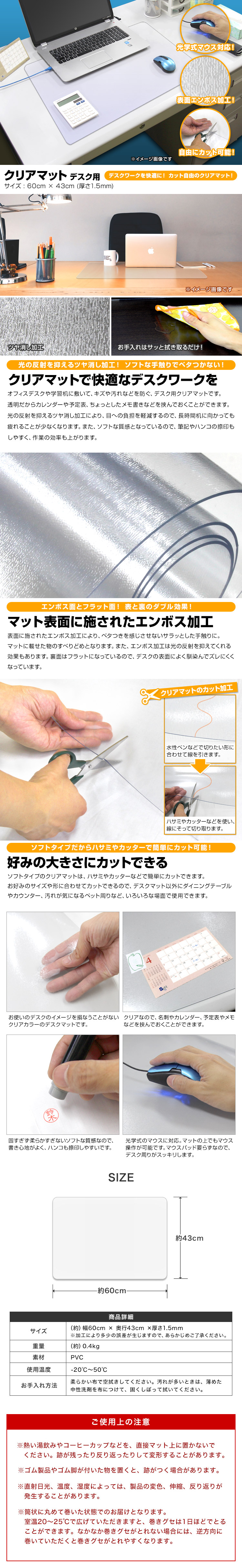 | カレンダーや予定表、メモなど挟めるクリアタイプのデスクマットです。 光学式マウスにも対応しているので、マウスパッドを使用せずにマウス操作ができます。 デスクマット表面にエンボス処理を施すことで、ベタつきを感じさせないサラっとした表面になっています。 また、このエンボス処理は光の反射を抑えてくれる効果も◎! ハサミで簡単にカットができるので、デスクマット以外にも、様々なシーンで使用できます! 【商品仕様】 カラー:クリア サイズ(約):幅60cm×奥行43cm(厚さ1.5mm) 材質:軟質PVC 使用温度(約):−20℃〜50℃ ※お手入れは薄めた中性洗剤を湿らした布につけ、固く絞って拭いた後、水分が残らないように乾いた布で乾拭きしてください。 ※日の当たる所で使用しないでください。日焼けで硬化する場合があります。 |