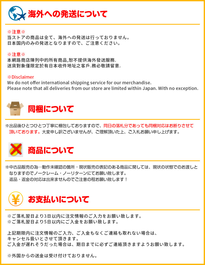 | 例) 落札金額が10万円の場合、 1回目の決済=10万円+消費税 2回目の決済=10万円+消費税+送料 合計20万+消費税+送料が決済され、その決済後、1回目の10万円+消費税がキャンセルとなります。 2回目の決済で与信枠を超えてしまった場合は、1回目の落札金額のみの決済が採用されますので、 送料は銀行振込となります事を予めご了承ください。 2回目の決済で与信枠を超える心配があるお客様、または、はじめから送料は銀行振込をご希望されるお客様は、 カートの「ストアへのご要望」欄に「送料は銀行振込希望」とご記入ください。 |