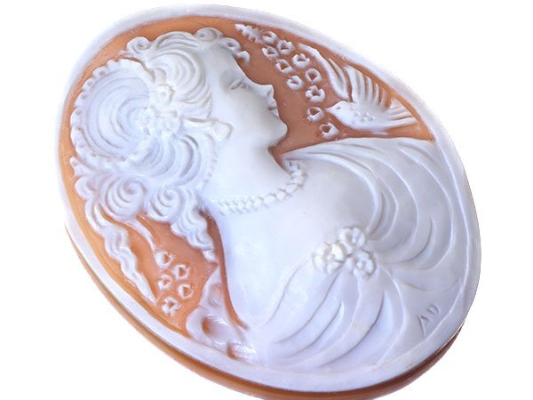 上品な女性と小鳥を繊細に彫刻で演出した、素晴らしい高級シェルカメオルースです!