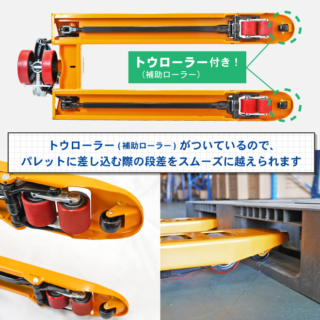 | 車輪 | ・ステアリングローラー Φ180×50mm(ポリウレタン) ・フォークローラー Φ74×70mm(ポリウレタン) ・トウローラー Φ49.5×30mm(プラスチック) |