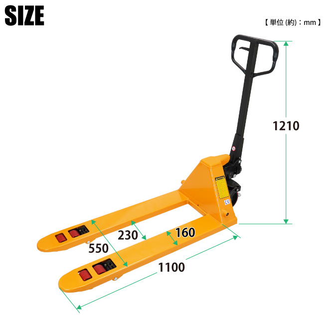 | サイズ | ・全長 1490mm ・フォーク長さ 1100mm ・フォーク全幅 550mm ・フォーク爪幅 160mm ・フォーク間 230mm ・フォーク最高/最低高さ 195/75mm |