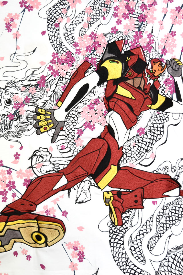 新感覚のオリエンタルブランド、錦さんから「EVANGELION×錦 桜龍2号機半袖Tシャツ(585351)」のご紹介です。 大人気コンテンツ「ヱヴァンゲリヲン」と錦のコラボシリーズから、最新作が登場!! 今回モチーフの主役に採用されたのは、弐号機。 龍を纏ってダイナミックに蹴りを入れる弐号機の姿が刺繍で表現されています。 背景の桜や龍にはプリントが用いられており、奥行きのある図案に仕上がりました。 フロント左胸には、弐号機のアイコンをワンポイントで刺繍しています。 ボディーにはコットン100%の天竺素材を使用。 | |||||||||||||||||||||||||