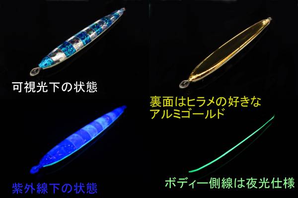 ②紫外線に反応するケイムラ仕様にしたので深場でも目立ちます