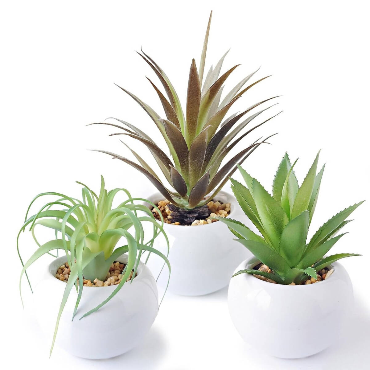このセットには、エアプランツ、アナナス、アガベの人工植物がそれぞれ個別の小さな鉢に植え込まれています。