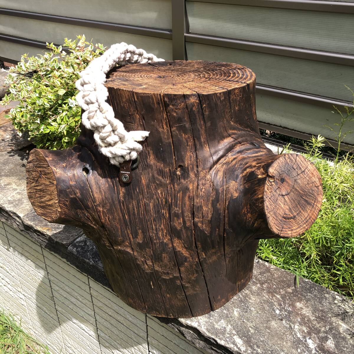 樹皮を剥がし、表面をバーナーで炙って虫が付きにくくしております。