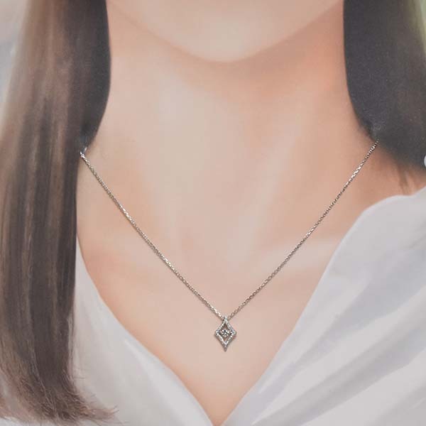 ひし形モチーフの中に1石のダイヤをセットしたデビアスの18金ホワイトゴールド製ネックレス。