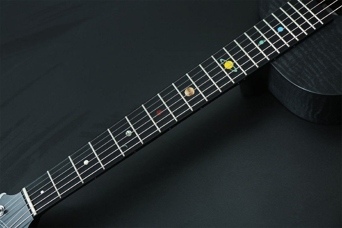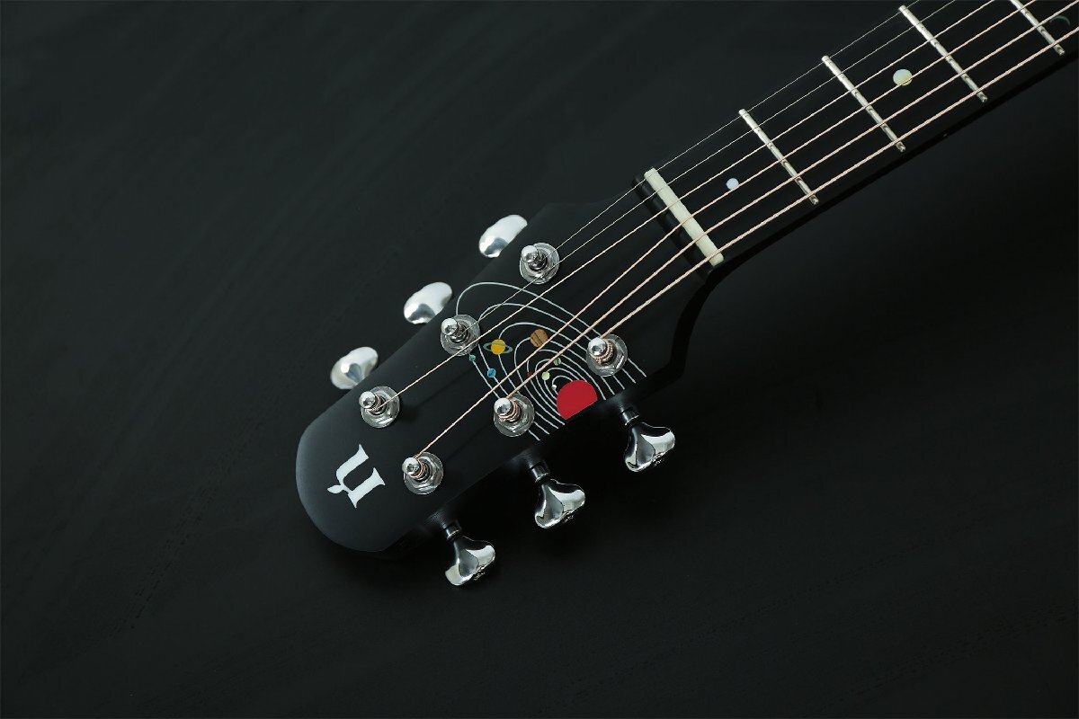 ソーラーシステムシリーズのBlack Holeモデルをスペックそのままで小型化しました。HPL(ハイ・プレッシャー・ラミネート)材を使ったボディはカラっとした明瞭なサウンドが特徴。指板とヘッドには、ソーラーシステムこと太陽系を示す個性的なインレイが入っています。惑星ごとに素材を変えるという凝った仕様です。