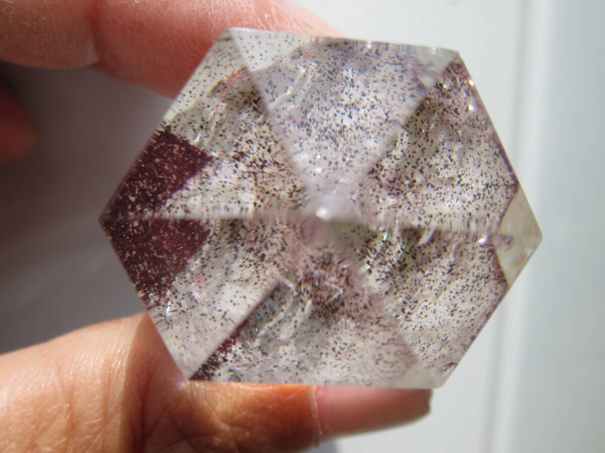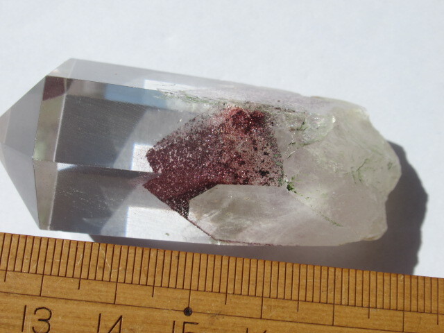 インド Madyapragesh州産のレピドクロサイト結晶群を山形に内包した水晶の研磨品。日光下でレピドクロサイトの結晶面にキラキラ感が有り見る方向によりレインボーが見られます。マトリックスは透明度が良好で内部を含めてヒビなどはほぼ見られません。緑色の付着物は研磨剤の酸化クロムの残渣と思われます。サイズ辺・辺太さ23から26mm、長さ66mm、重さ65,6g。送料無料。