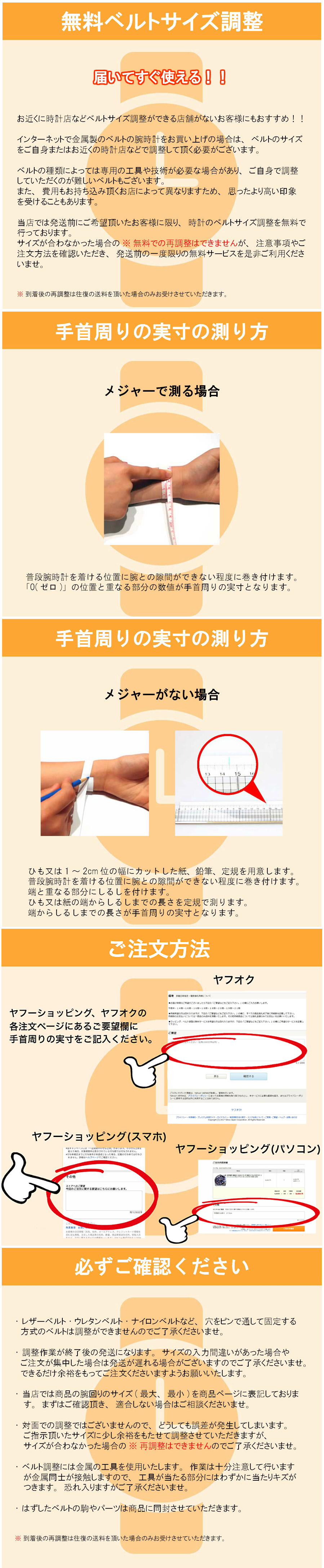 無料サービス | ●出荷前に腕周りをご指定頂ければ、無料でベルト調節致します。 ※メタルベルトの商品で、縮める場合のみ ※サイズが合わなかった場合の再調整はお受けできませんので何卒ご了承ください。 |