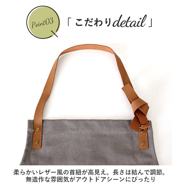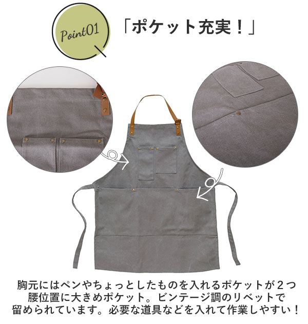 | 商品説明 | しっかりした厚手のキャンバス生地のエプロンです。ウオッシュ加工された生地で、女性にも男性にも合うシンプルなデザイン。首の紐は合皮で、ポケットはビンテージ調のリベットで留められています。大きめポケットの扱いやすいエプロンです。 |