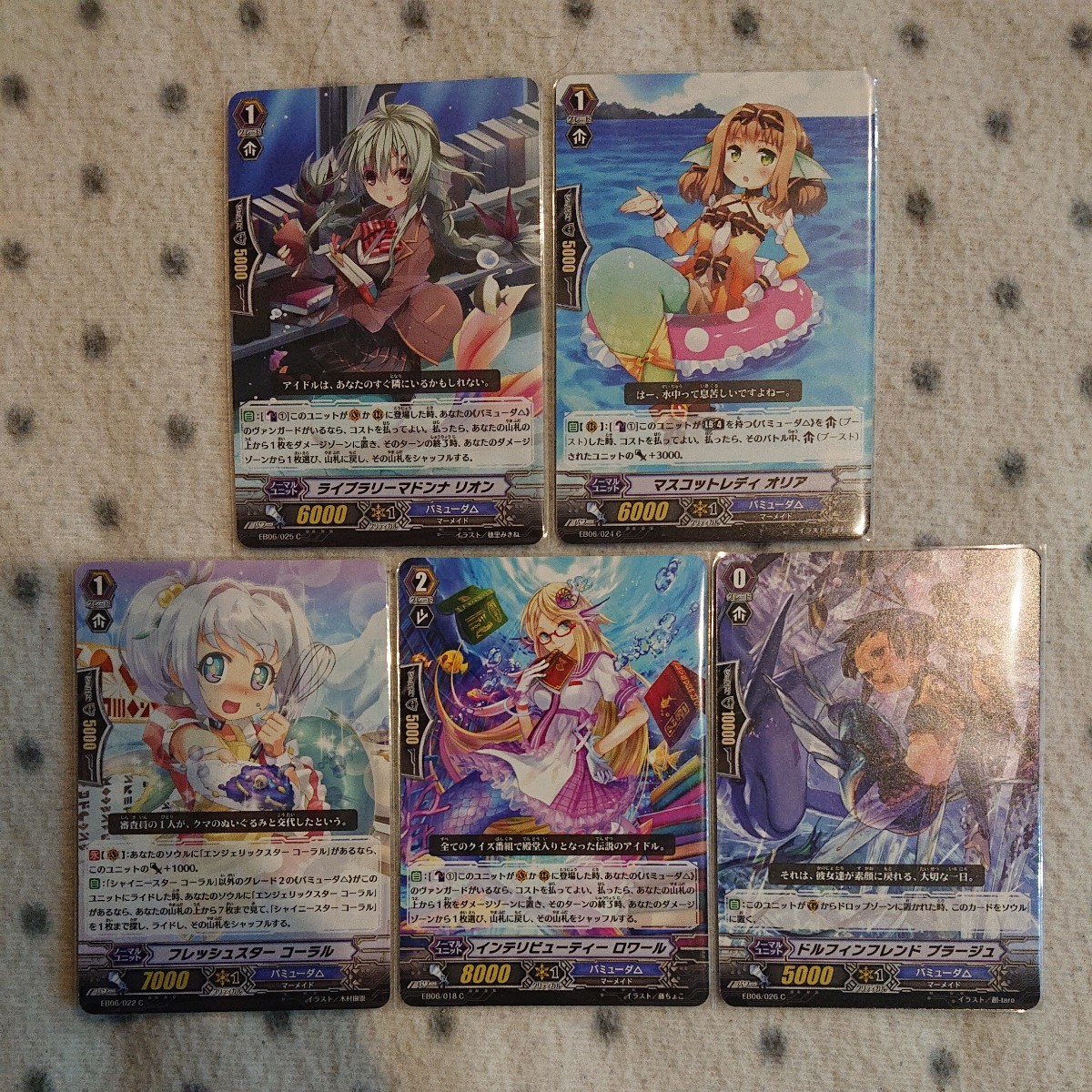 カードファイト!!ヴァンガード 綺羅の歌姫 の ノーマルユニット(コモン)5枚セット( ライブラリーマドンナ リオン 、 マスコットレディ オリア 、 フレッシュスター コーラル 、 インテリビューティー ロワール 、 ドルフィンフレンド プラージュ ) です。