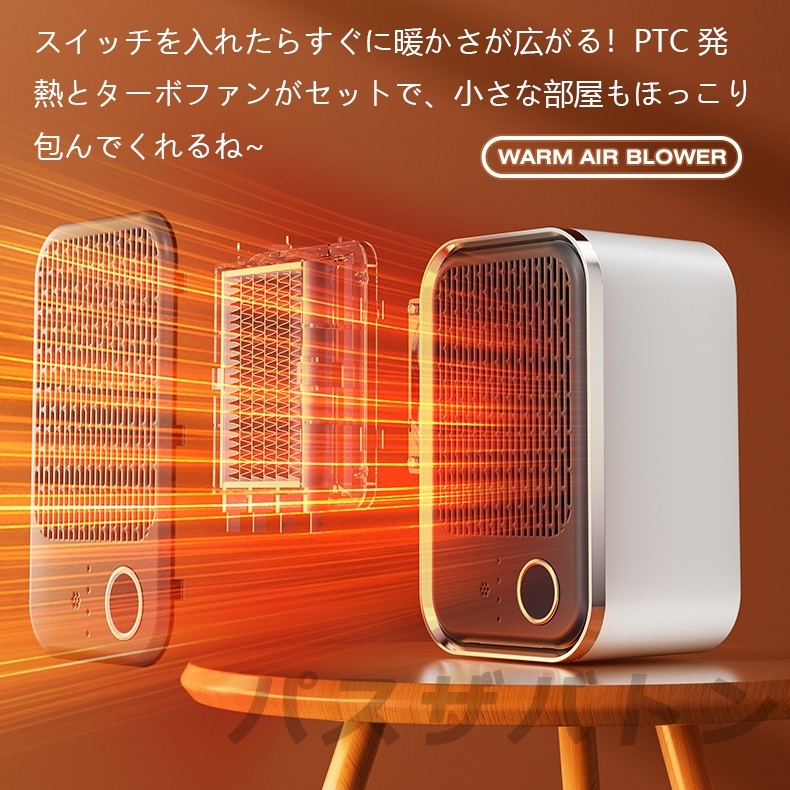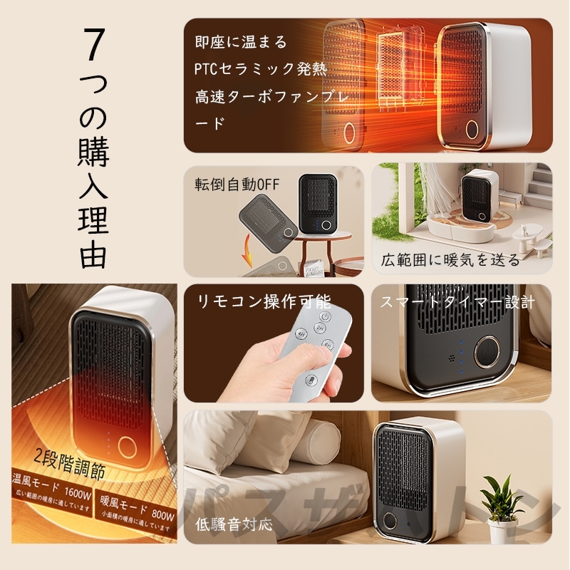 セラミックヒーター 小型 ファンヒーター PTC 速暖 省エネ 脱衣所 足元 ミニ ヒーター コンパクト 1600W 2秒速暖 2段階切替 過熱保護