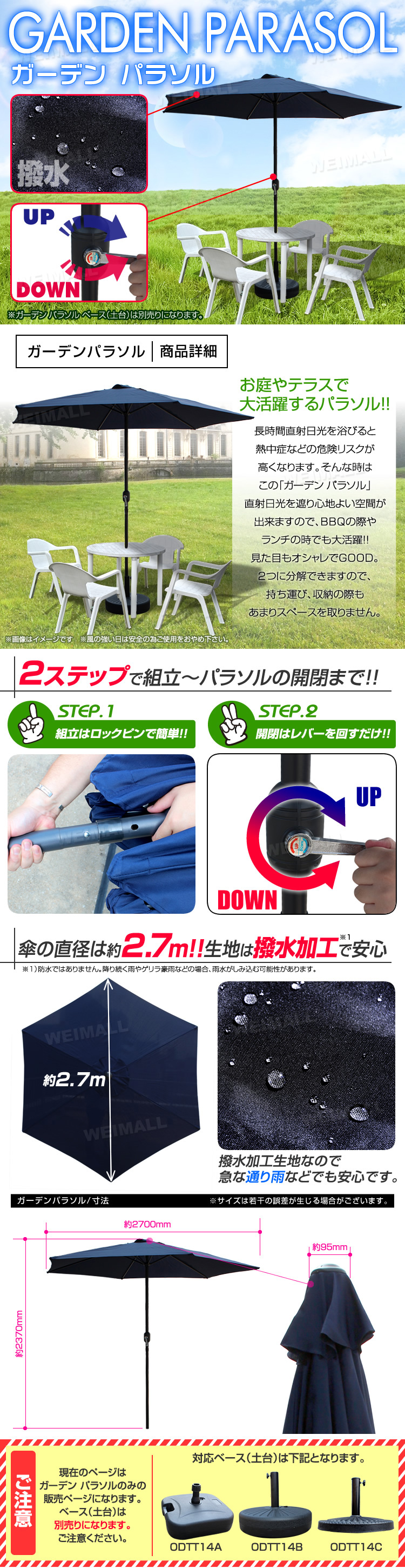 日差しから守るガーデンパラソルです。 バーベキューにピクニックにビアガーデンと晴れた日には欠かせないアイテム! ハンドル式で開閉が簡単! ハンドルをくるくる回るだけなので、女性でも簡単に傘を開くことができます。 パラソルの支柱は2つに分かれるので、持ち運びもラクラク! 水や汚れに強い撥水加工! 雨に濡れても水を弾くので、雨漏れする心配はありません!お手入れもサッと拭くだけで簡単! ※完全防水ではありません。 【商品仕様】 オープン時サイズ(約):幅2700×奥行2700×高さ2370mm 支柱径(約)直径40mm 重量(約):4.5kg カラー:ネイビー 材質:ポリエステル、アルミ 【注意事項】 ・お客様による組み立て商品です。 ・強風時は破損、転倒などの危険がありますので、ご使用はおやめください。 ・傘生地には撥水加工をしておりますが、完全防水ではありません。 ・同梱されている説明書に一部誤りがございます。パラソル固定用のネジが2個と記載されていますが1個の誤りです。予めご了承ください。  |