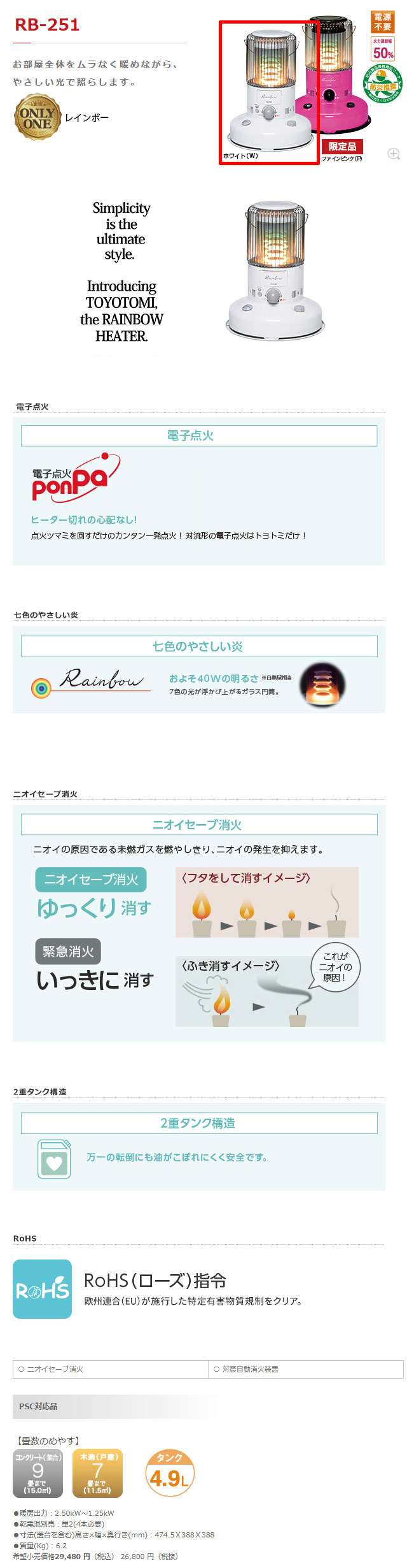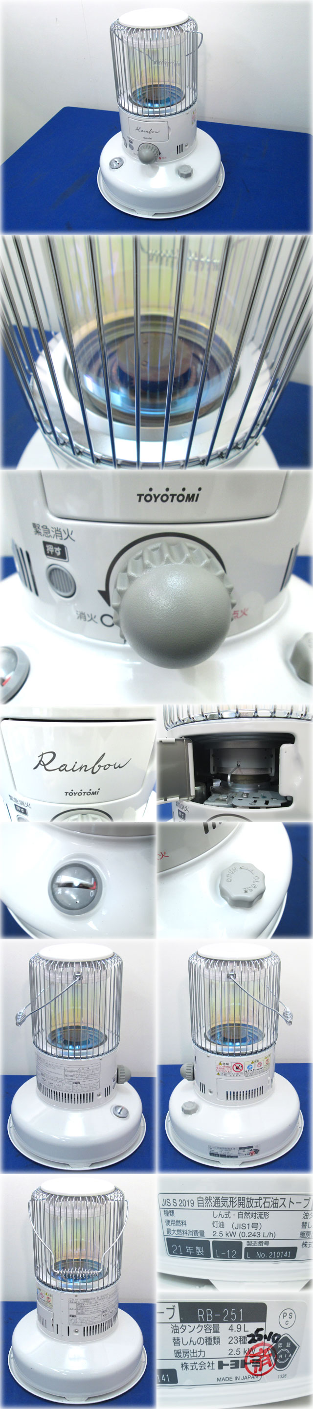 トヨトミ 石油ストーブ レインボー RB-251(W) を出品いたします。 ■特徴■ お部屋全体をムラなく暖めながら、 やさしい光で照らします。 電子点火PonPa ヒーター切れの心配なし! 点火ツマミを回すだけのカンタン一発点火! 対流形の電子点火はトヨトミだけ! 七色のやさしい炎 およそ40Wの明るさ※白熱球相当 7色の光が浮かび上がるガラス円筒。 ニオイセーブ消火 ニオイの原因である未燃ガスを燃やしきり、 ニオイの発生を抑えます。 2重タンク構造 万一の転倒にも油がこぼれにくく安全です。 RoHS (ローズ)指令 欧州連合(EU)が施行した 特定有害物質規制をクリア。 ■仕様■