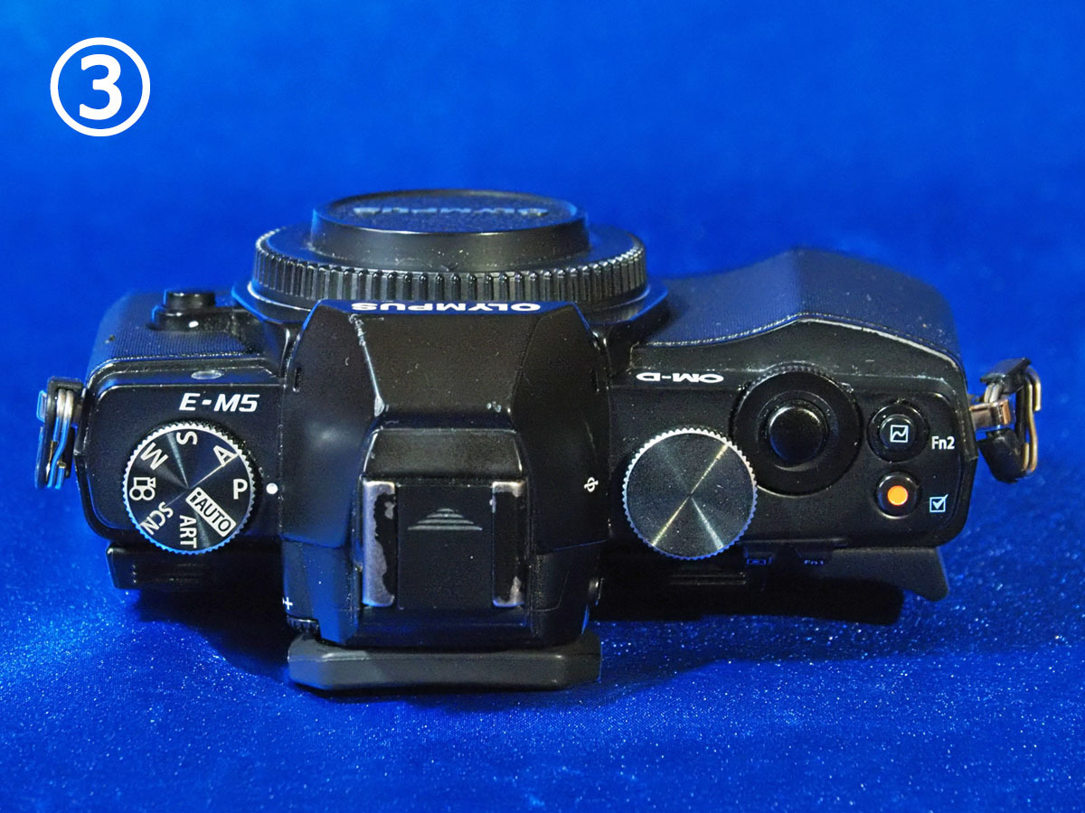 見苦しいほどのキズや凹みはありません。 ただし実用していたので、外観には細かなひっかき傷、エッジ部塗装ハゲ、経年変化による変色が少しあります。 やや目立つところでは、フラッシュを取り付けるシューガイド部分の塗装ハゲと、三脚を付けるときなどに付いた底部のひっかき傷やエッジ部塗装ハゲがあります。