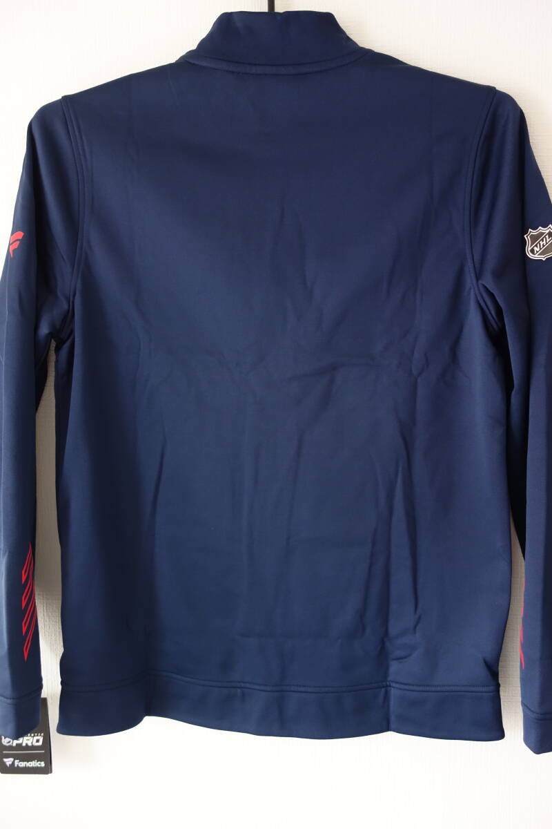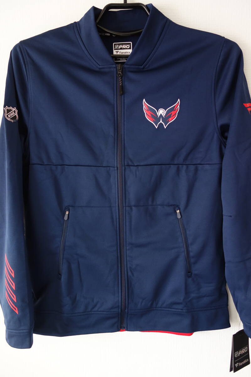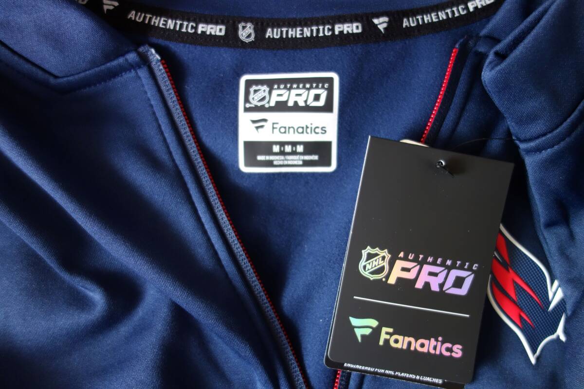 キャピタルズのオーセンティックジャケット、選手着用モデルです。ファナティクス社製、色:ネイビー、サイズ:M(身幅約53cm、着丈約78cm)、新品未使用タグ付きです。