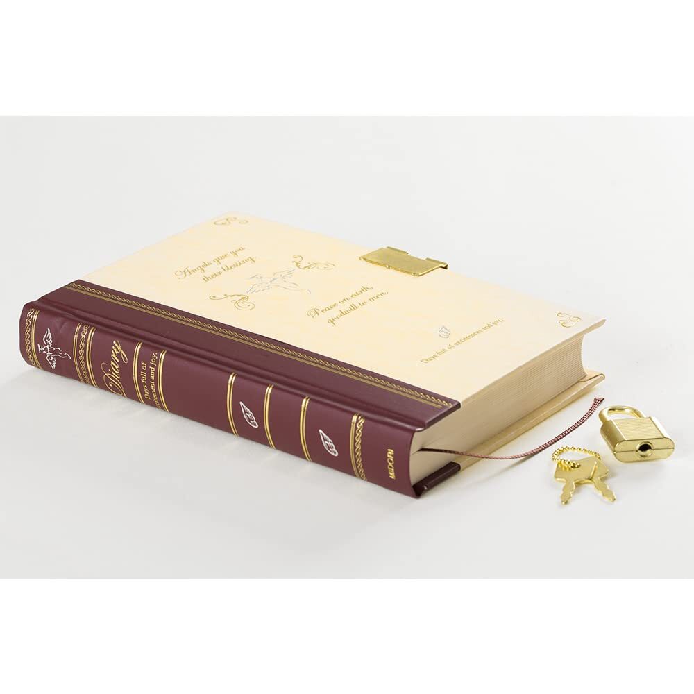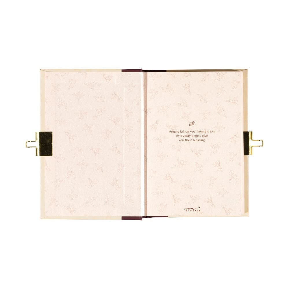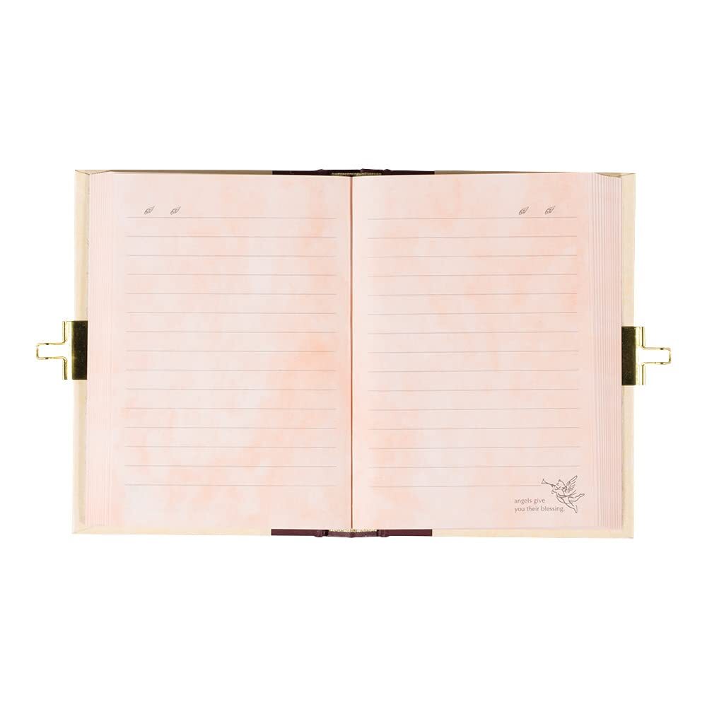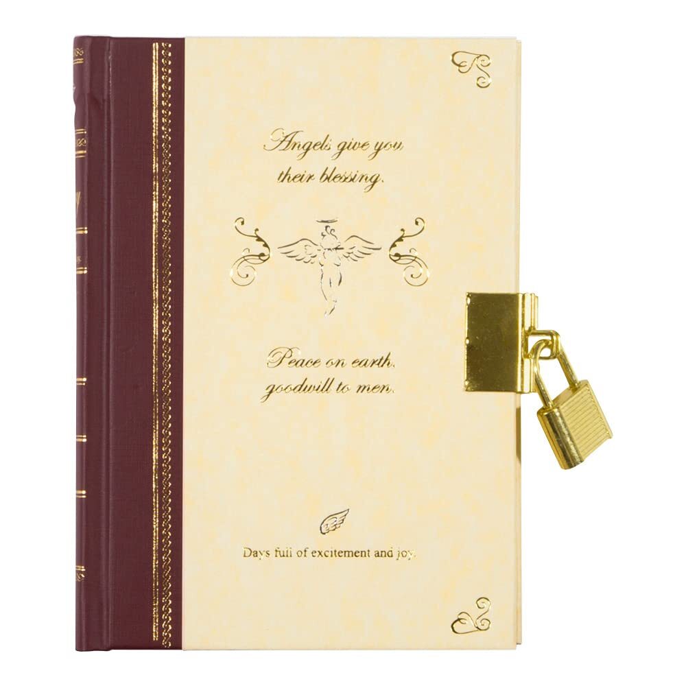 【鍵付きの自由日記】 中紙は日付欄と罫線だけのシンプルなフォーマット。天使の絵柄がワンポイントになっています。 日付を自分で書き込むフリータイプなので、いつでも始められ、書きたいときに書きたいだけ自分のペースで書くことができます。 表紙の箔押しが上品な印象で、プレゼントにもおすすめです。商品名:ミドリ 日記 鍵付 天使柄 12370006