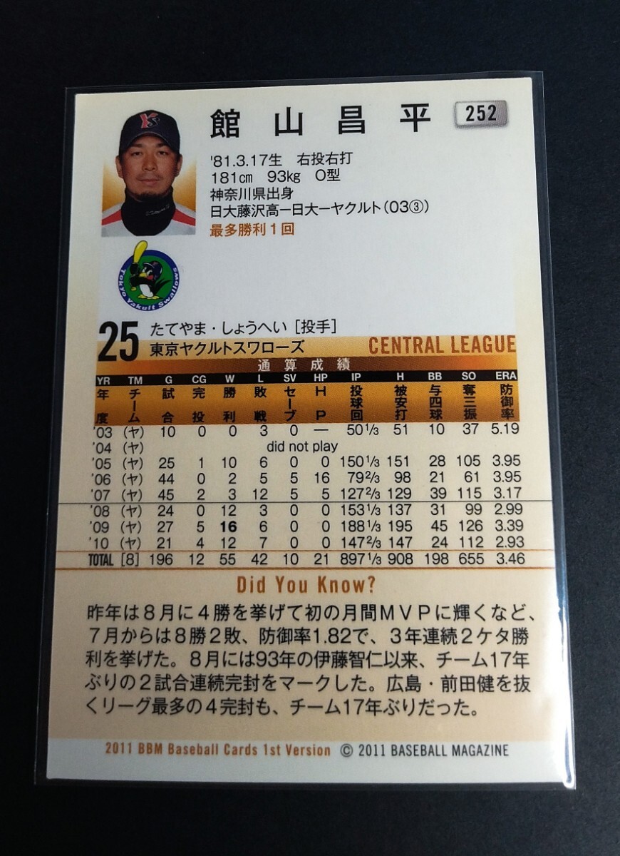 2011年BBM 1st 館山昌平(ヤクルト)銀箔サイン入り。No,252。