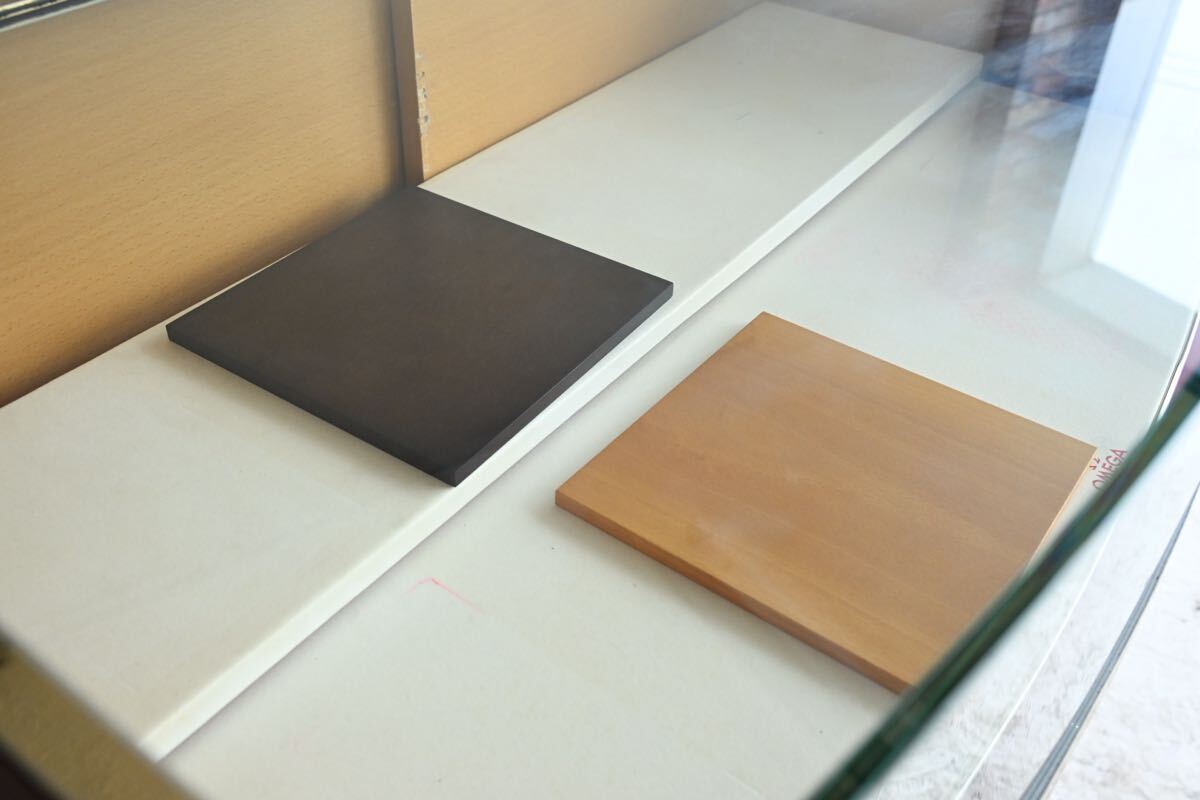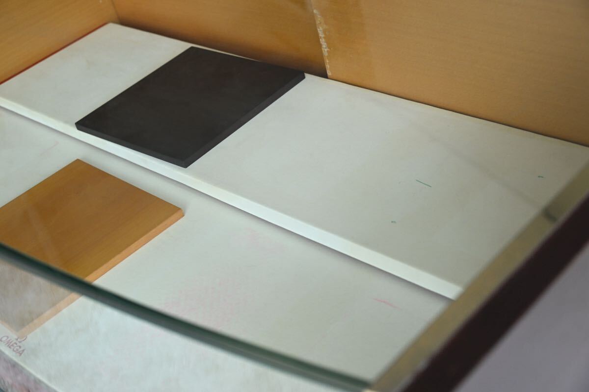 白い合皮部分に木の板が張り付いてしまっています。 無理に剥がすと破れそうなので、そのままにしています。 |