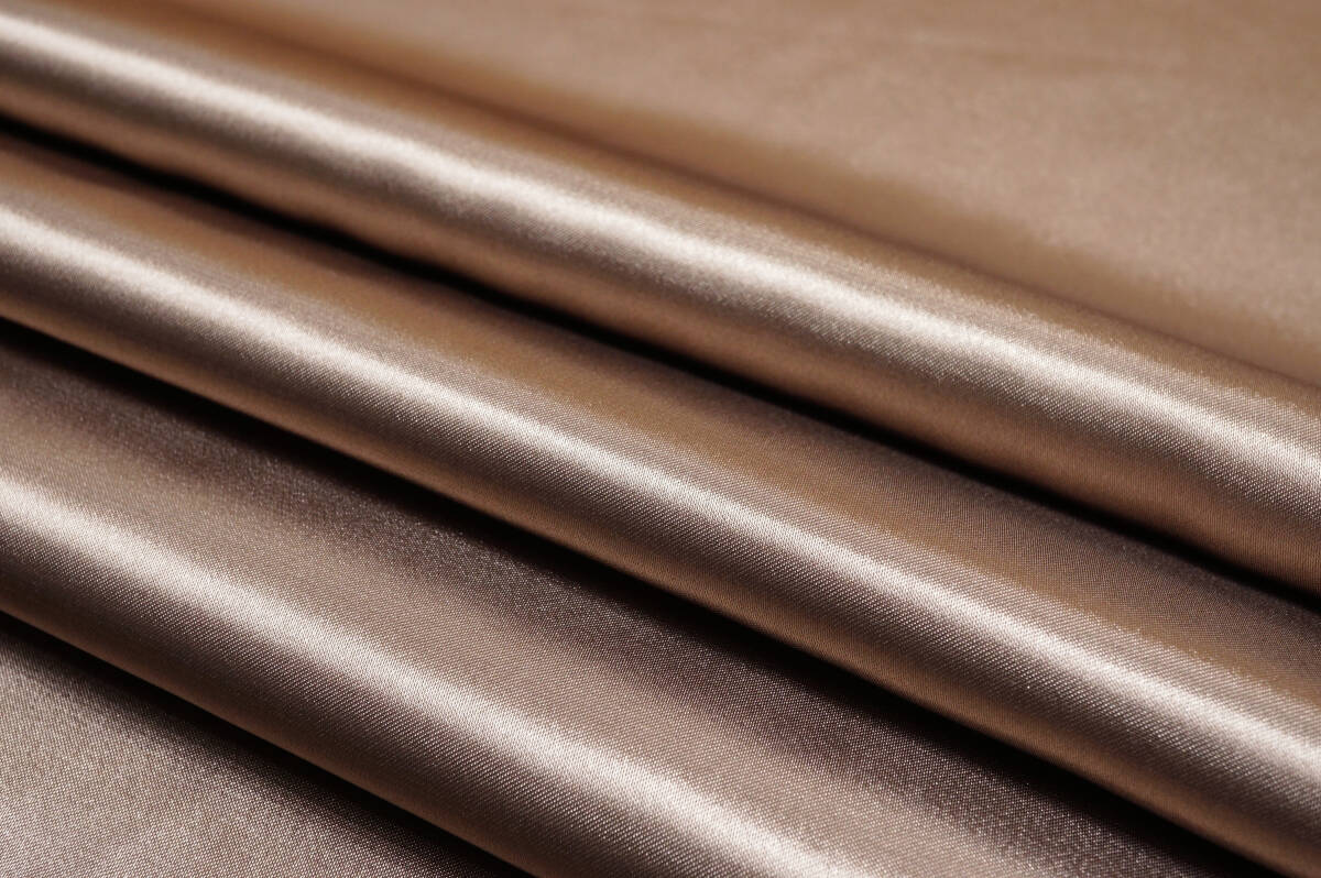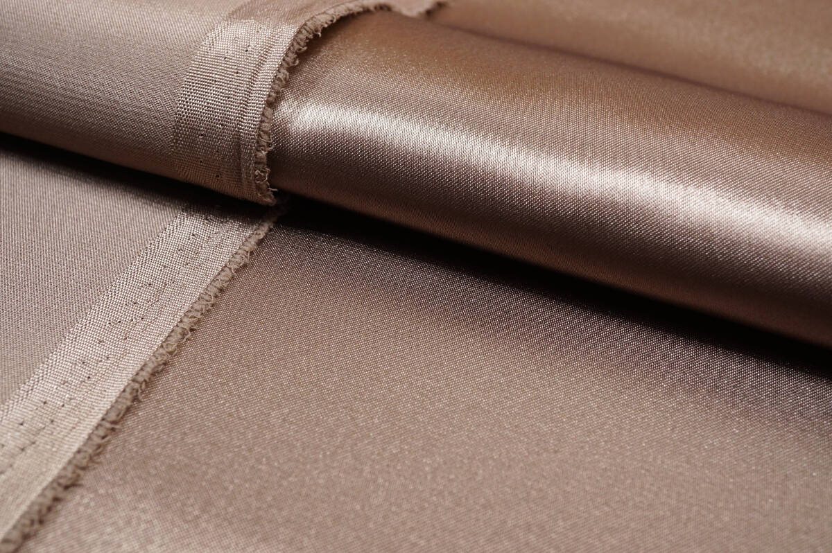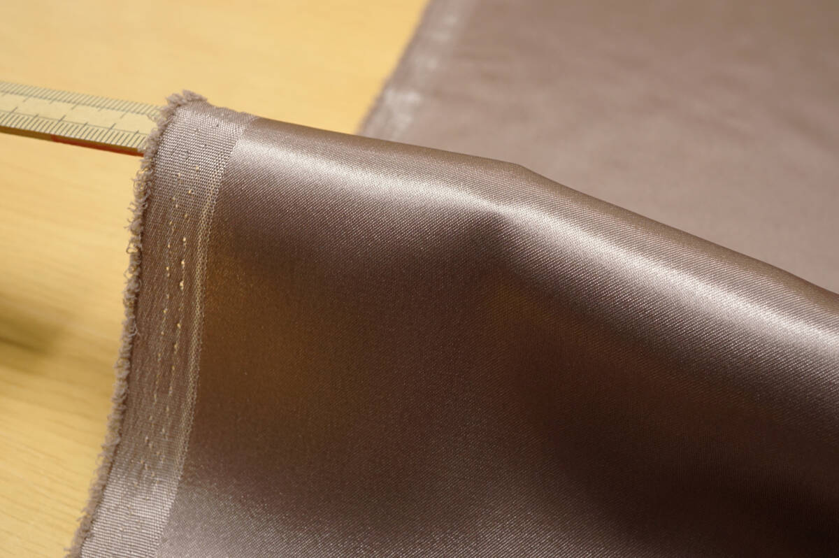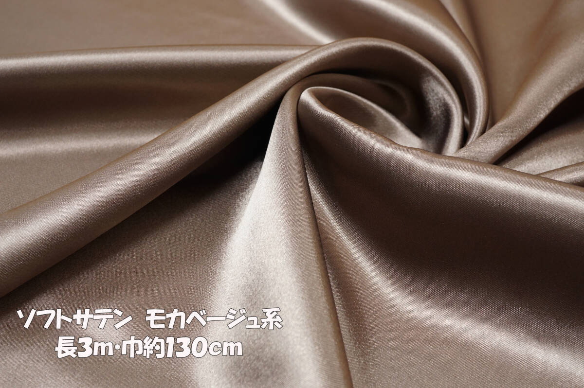 ポリエステル100%、微薄地程度、程よいソフト系、ドレープ感、色調:モカベージュ系で、光沢感があり伸縮性は無く、総長3m・巾約130cm W巾でございます。