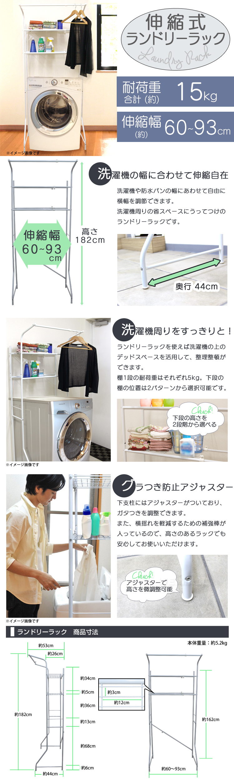 洗濯機やトレイなどの環境に合わせて幅が伸縮するのでピッタリサイズで使えます。 洗濯機から、洗濯物を干す時に便利なハンガーラック付き!外に出す前に一時的にハンガーラックで洗濯物を掛けられるので便利です。 ネット棚2枚付きで洗剤などの小物も置きやすいです。 アジャスター付き。 【商品仕様】 カラー:ホワイト サイズ(約):幅60~93cm×奥行53cmx高さ182cm 重量(約):5.2kg 棚の奥行サイズ(約):26cm 耐荷重: ・棚:5kg×2段 ・ハンガー部:5kg 材質:スチール、ポリプロピレン 他 ※お客様組み立て商品です。 |