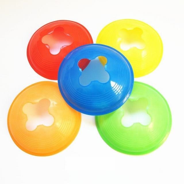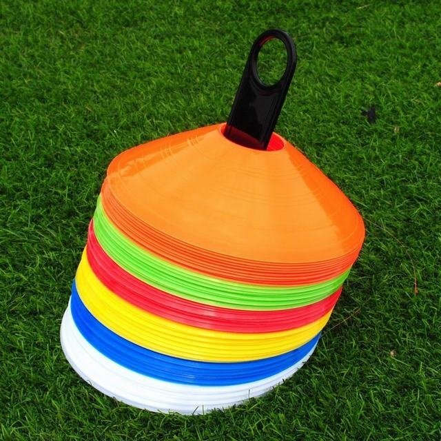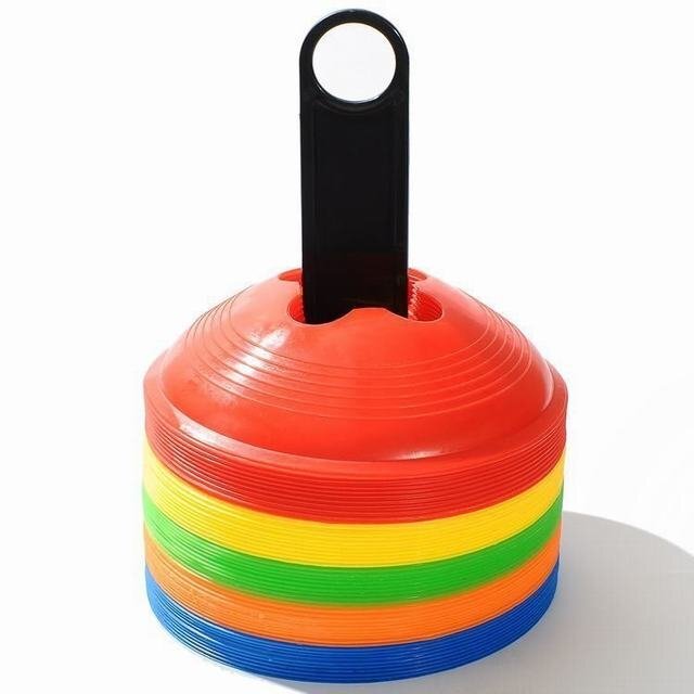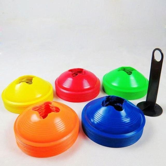 "柔らかい素材でケガ防止! マーカーコーン 50枚セット 5色各10枚 三角のカラーコーンよりも置いていてずれにくく、また倒れることがないので、より効率的にトレーニングができます。 【商品詳細】 サイズ:上直径5.5cm / 下直径19cm / 高さ4.5cm カラー:赤?青?オレンジ?黄色?蛍光黄色