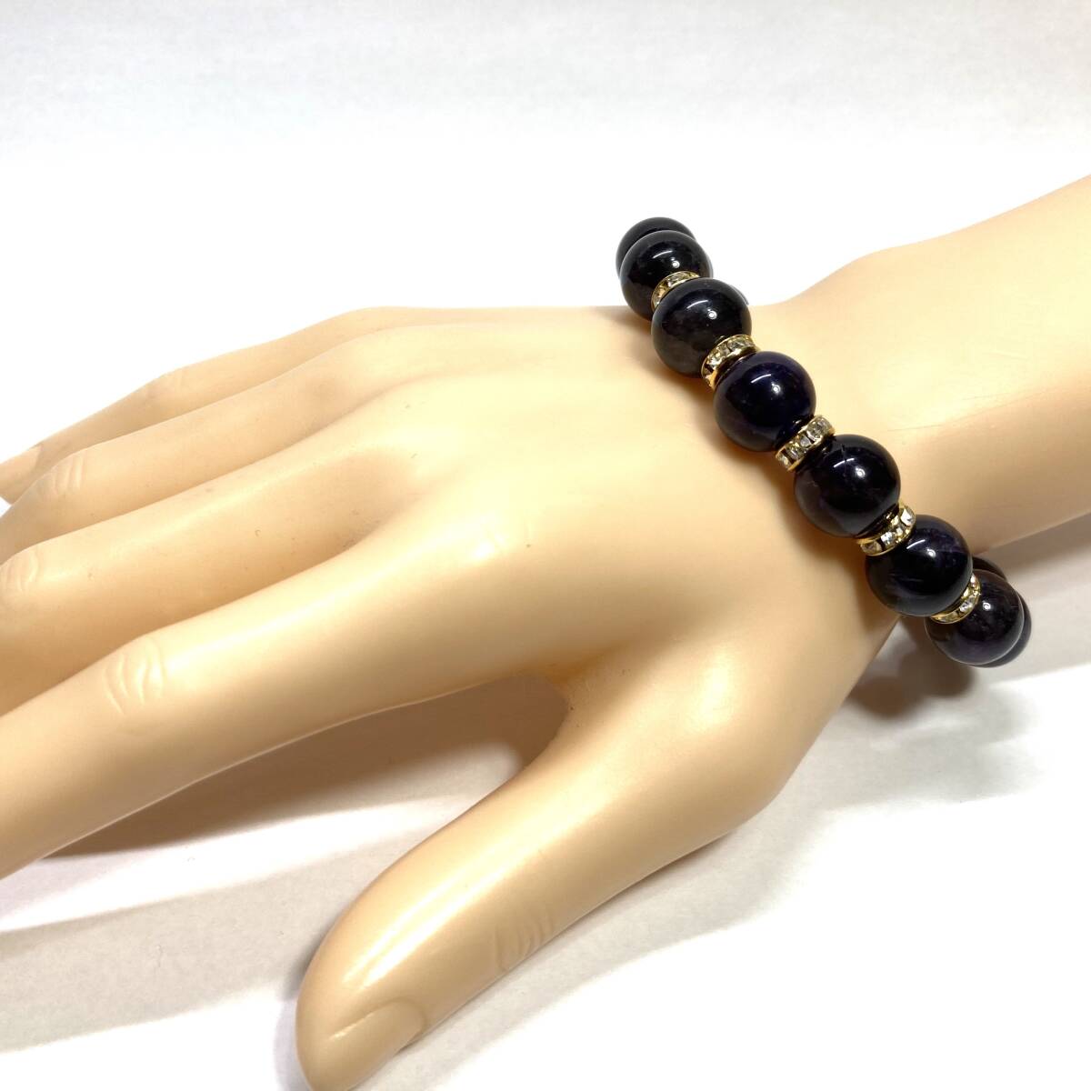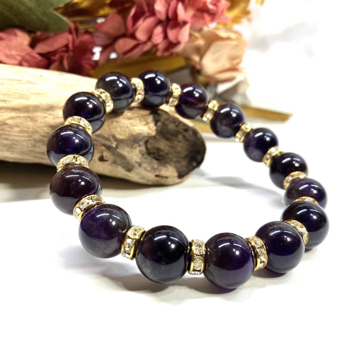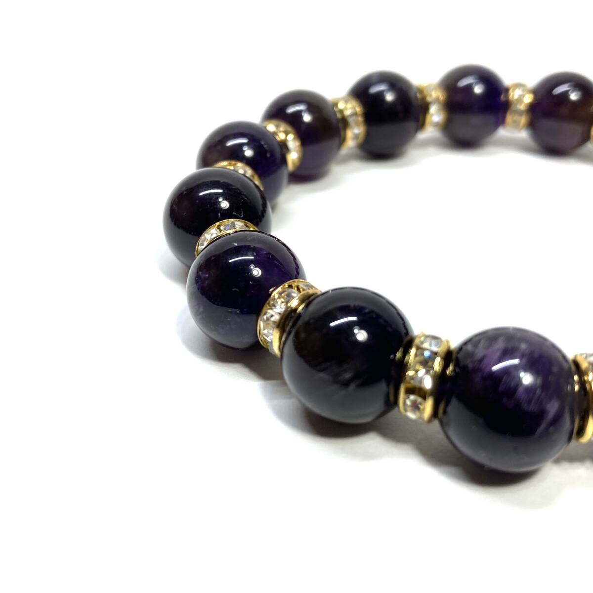 こちらは、12mm玉のアメジストを使用したパワーストーンブレスレットです。間にはロンデルを挟み高級感を演出しております。男女問わずどんなコーディネートとも合わせ易いブレスレットです。サイズは内周約18cmです。(サイズ変更の場合は取引ナビにてご連絡をお願いします。) 数に限りがございますので気になる方はお早めにどうぞ。