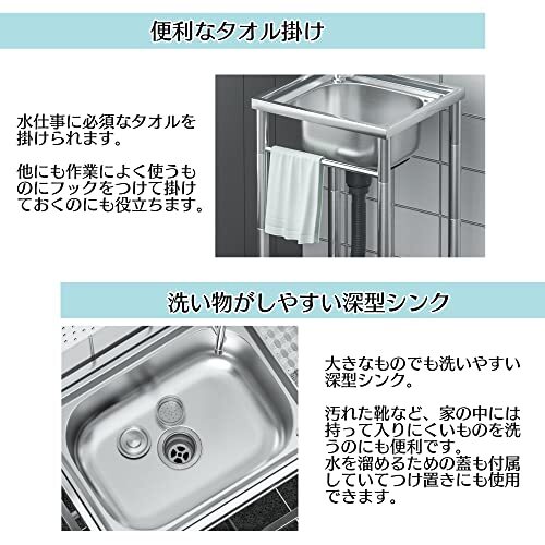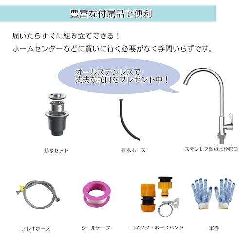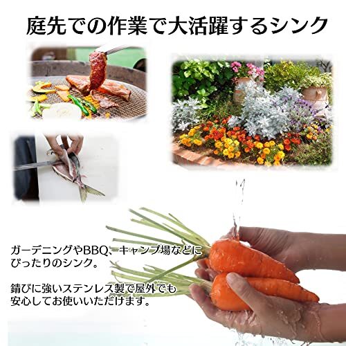 【様々な場所に設置可能】 庭先やベランダ、畑、工場など活躍の場は様々。お庭でのガーデニングやBBQなどでも大活躍する流し台です。蛇口付きなので台所に近い感覚で使いやすく、生臭さが気になる釣った魚の下処理、泥のついた野菜洗い、家の中では汚れが気になる用具洗いなどにもぴったりです。 材質はサビやキズに強いステンレス製。雨風にも強く、屋外に設置したままでも安心して使い続けられます。 ※シンクでの作業終了時には水分や汚れをよく拭き取ってください。 清潔な状態を保つことにより、さらにサビの発生を予防することができます。