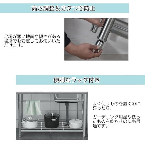 【便利な収納台とアジャスター】流し台の下には作業に必要な道具や洗った物を置くことができる、広くて便利な収納台がついています。 ガーデニングに使う園芸用付の土などの重いもの、よく使う用具などを置いておくとサッと使えて大変便利です。周りに仕切りが無いので広々とお使いいただけます。脚には高さの微調整が可能なアジャスターが付いているので、平らでない地面でもガタつきを軽減できます。