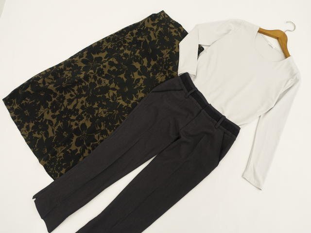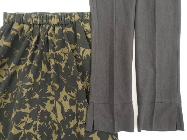 長袖カットソー+アンクル丈パンツ+ロング丈フレアスカート コーディネート上下3点セット S相当 ライトグレー/グレー×ブラック/グリーン系×ブラック 花柄 クール・きれいめ・シンプル系 20代・30代・40代