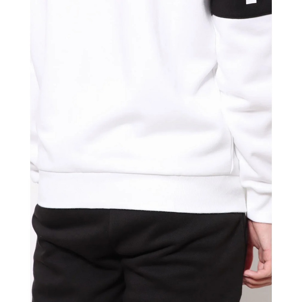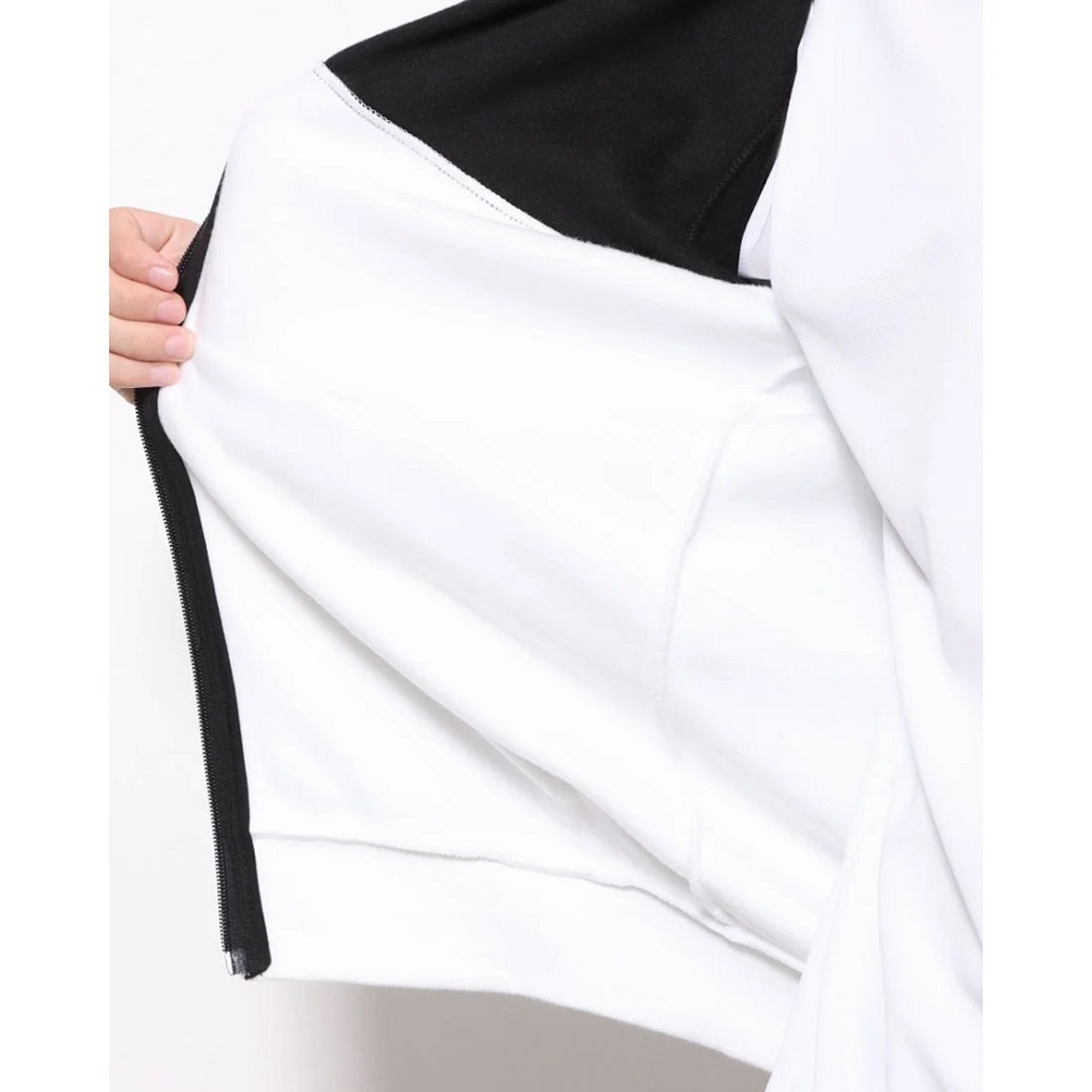 大胆なカラーブロックの切り替えと両袖のロゴプリントがデザインアクセントになっています。