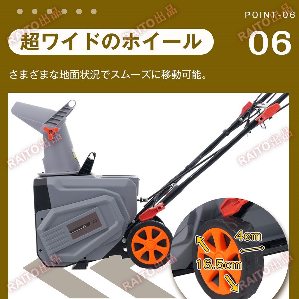 【10メートルの電源ケーブル】家庭用100V電源に対応なのでコンセントにさすだけでご使用いただけます。PSEマークを取得しています。本製品はPSEマーク(電気用品安全法)を認証届出済みです高い技術基準に適合した品質の高い製品です。安心してお使いいただけます。 【超ワイドのホイール】さまざまな地面状況でスムーズに移動可能。場所を気にせず気軽に除雪床や屋根を傷つけない地面を傷つけない