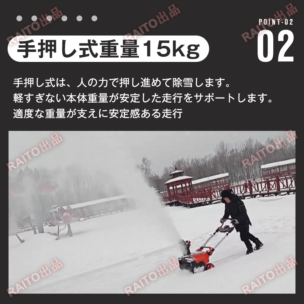 【手押し式重量15kg】手押し式は、人の力で押し進めて除雪します。軽すぎない本体重量が安定した走行をサポートします。適度な重量が支えに安定感ある走行
