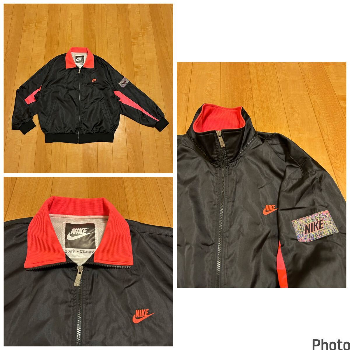 レア型.良品☆90s ナイキ メンズサイズXL 裏地付.ブラックナイロン切替ジャージ/ジャケット 希少.ライトニングサンダーロゴパッチ付&刺繍入