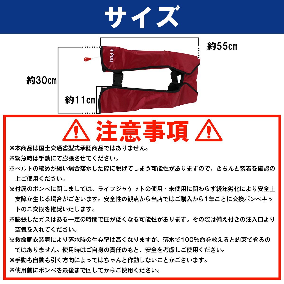 ●救命胴衣装着により落水時の生存率は高くなりますが、落水で100%命を救えると約束できるものではありません。