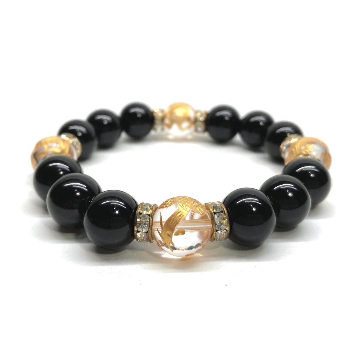 こちらは、四神獣金彫水晶とオニキスを組み合わせたパワーストーンブレスレットです。四神獣は、中国の伝説で4つの方向(東西南北)を守護する神聖な神。四神獣、厄災から身を守り、多くの運気を呼び込むと言われております。石大きさは程よくインパクトのある12mm玉で内周 約17cmです。 数に限りがございますので気になる方はお早めにどうぞ。