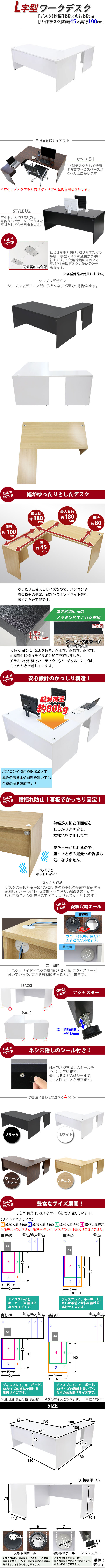 | 商品紹介 | ■作業スペースを広く確保出来る、L字型ワークデスクです。 ■サイドデスクの幅が約45cmのタイプです。 ■会議室や事務所等、オフィス家具として様々なシーンでお使いいただけます。 ■天板には、メラミン加工を施しています。 ■幕板が天板と側面板をがっちりと固定!横揺れを防止します。 ■ネジ穴隠しのシール付き。 ■デスクの天板と幕板に配線収納ホールが2カ所ずつ備わっています。 ■アジャスターで高さの調節が可能です。(高さ調節範囲〜約15mm) ※こちらの商品は、組立て式です。組立てにはプラスドライバーが必要です。お客様でご用意ください。 ※組立図が付属します。 ※サイドデスクの取り付けはデスクの左側専用となります。 ■材質:パーティクル(パーチクル)ボード(メラミン加工)(本体、サイドデスク)、プラスチック(アジャスター、配線収納ホール) ■重量:約63kg(デスク:約47kg、サイドデスク:約16kg) ■総耐荷重:約80kg ●新品商品ではありますが、輸入商品の為、多少の擦り傷などがある場合がございますので、ご納得の上ご購入下さいませ。 ●ご購入後、お客様ご都合によるご返品、ご返金等は一切お受け致しておりません。 ●本商品を使用した際に発生したトラブル、事故につきまして、当社は一切の責任を負いません。ご使用に関しましては、全て自己責任にてお願い致します。 ※カラーはホワイトとなります。 |