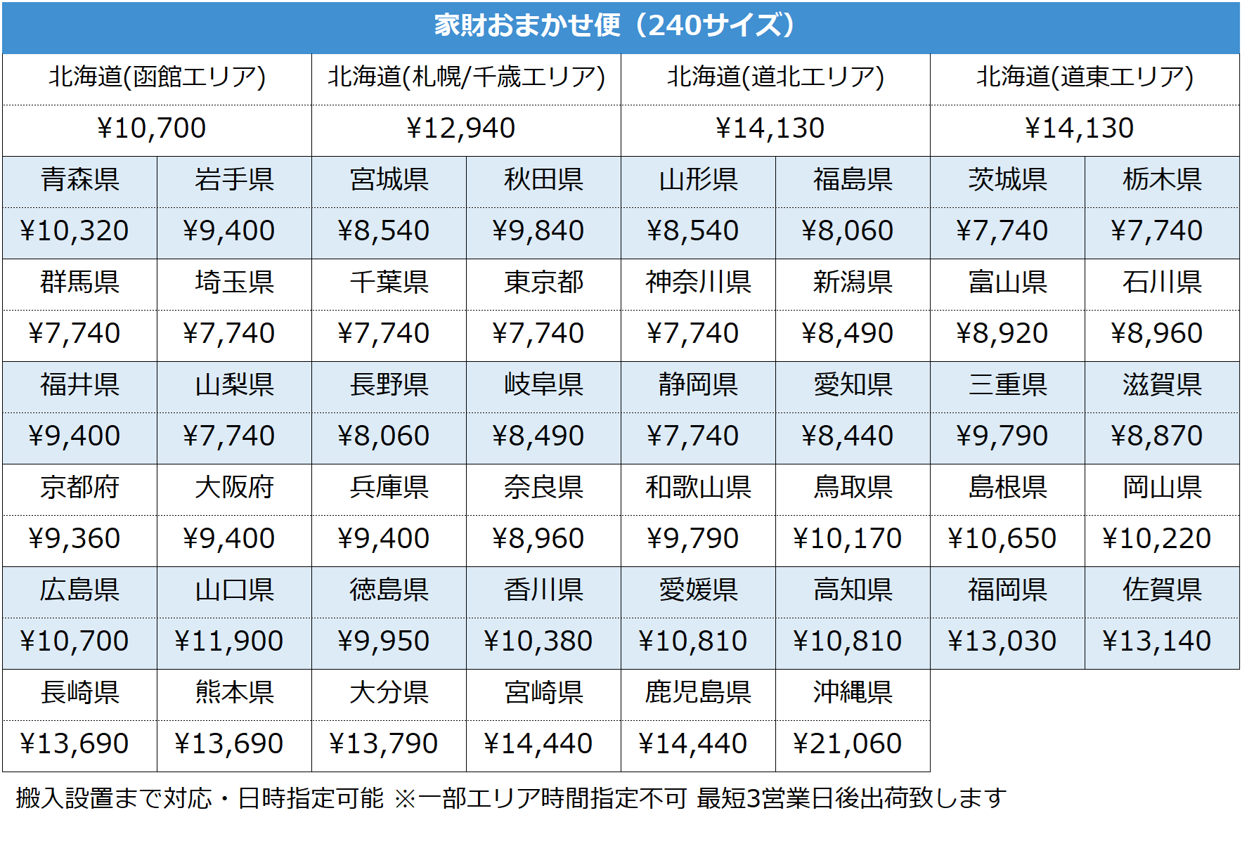 以下配送方法をご案内させて頂きます。 ご落札金額(税込み)+送料の合計をお支払下さい。 ※複数点ご購入の場合、落札数量×都道府県別料金=送料金額となります。 |