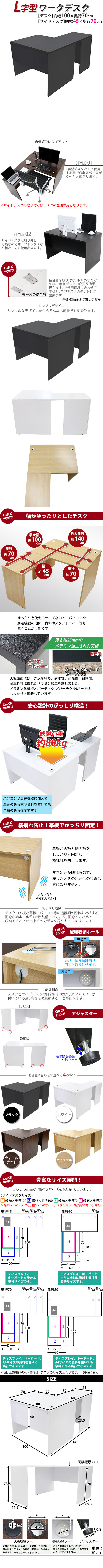 | 商品紹介 | ■作業スペースを広く確保出来る、L字型ワークデスクです。 ■サイドデスクの幅が約45cmのタイプです。 ■会議室や事務所等、オフィス家具として様々なシーンでお使いいただけます。 ■天板には、メラミン加工を施しています。 ■幕板が天板と側面板をがっちりと固定!横揺れを防止します。 ■ネジ穴隠しのシール付き。(サイドデスクのみ付属) ■デスクの天板と幕板に配線収納ホールが2カ所ずつ備わっています。 ■アジャスターで高さの調節が可能です。(高さ調節範囲〜約15mm) ※こちらの商品は、組立て式です。組立てにはプラスドライバーが必要です。お客様でご用意ください。 ※組立図が付属します。 ※サイドデスクの取り付けはデスクの左側専用となります。 ■材質:パーティクル(パーチクル)ボード(メラミン加工)(本体、サイドデスク)、プラスチック(アジャスター、配線収納ホール) ■重量:約41kg(デスク:約28kg、サイドデスク:約13kg) ■総耐荷重:約80kg ●新品商品ではありますが、輸入商品の為、多少の擦り傷などがある場合がございますので、ご納得の上ご購入下さいませ。 ●ご購入後、お客様ご都合によるご返品、ご返金等は一切お受け致しておりません。 ●本商品を使用した際に発生したトラブル、事故につきまして、当社は一切の責任を負いません。ご使用に関しましては、全て自己責任にてお願い致します。 ※カラーはブラックとなります。 |